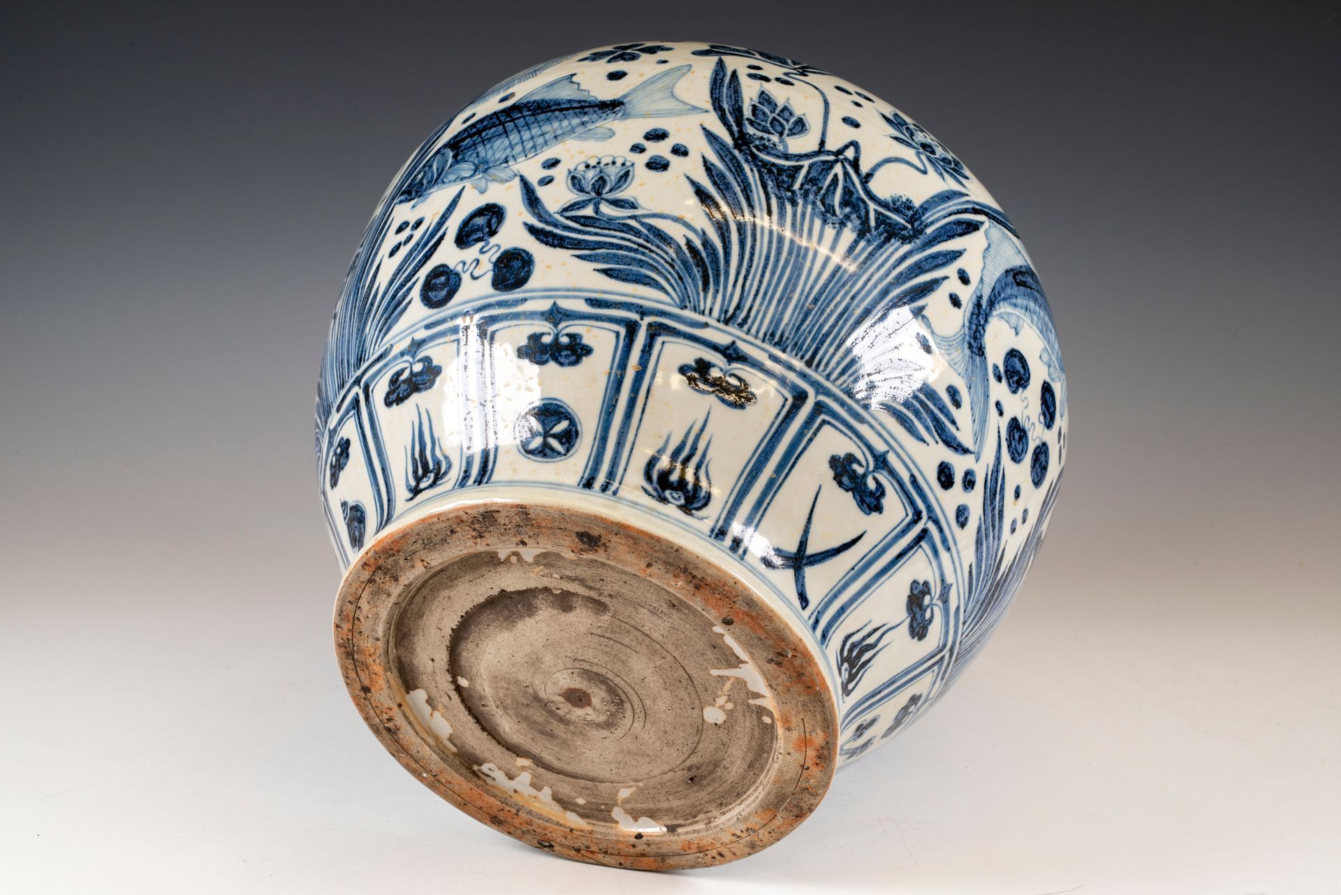 この美しい青白磁の元代壷は、水生植物に囲まれた魚の精巧な描写で飾られており、当時の卓越した職人技を如実に物語っています。この壷には、独特の黒みがかった色合いを持つ輸入サマリブルーコバルトが使用されています。特に注目すべきは、山積みされた釉薬の表面が乱れることで、中国産のコバルトに見られる茶色の色合いではなく、黒い斑点や銀色の反射が現れる点です。この独特の特徴は、この壷の真贋を証明しています。コバルトは5世紀以上も入手不可能だったからです。添付の画像は、この壷が2つの部分に接合されていることを示しています。これは元代の多くの壷に見られる一般的な手法です。さらに、素焼きの剥がれも、この壷が相当古いものであることを物語っています。壷の高さは約12インチ(約30cm)で、歴史的芸術作品として重要かつ注目に値する作品です。ppjrs