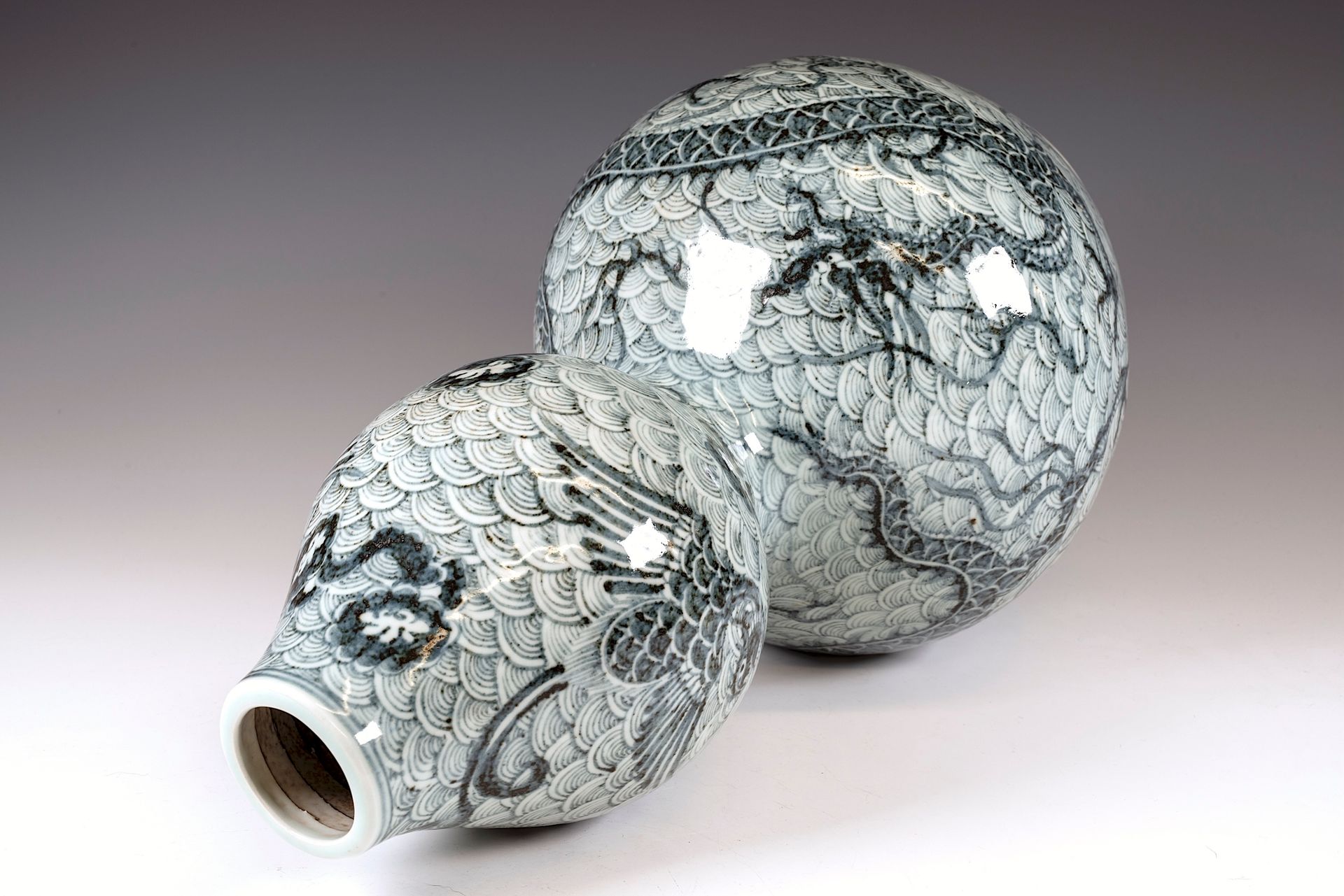 元代青白磁双瓢箪花瓶は、水面を駆け抜ける二匹の龍と、雲間を舞う二羽の鳳凰が特徴的な、比類なき工芸品です。この逸品は、独特の黒みがかった色合いで知られる輸入サマリ産青コバルトから作られています。精巧な積み上げ技法により、表面には黒い斑点だけでなく銀色の反射も見られ、中国産コバルト特有の茶色の色合いとは異なります。さらに、この花瓶は緑がかった色合いを呈しており、これはこのコバルトの特有の鉱物組成に起因する真正さの証です。この特徴と年代は、この種類のコバルトが500年以上も入手不可能であったことと相まって、非常に重要な意味を持ちます。さらに、素地の剥落も、この花瓶の相当な古さを裏付けています。この精巧な花瓶の全体の高さは約18 5/8インチです。 ppjrs
