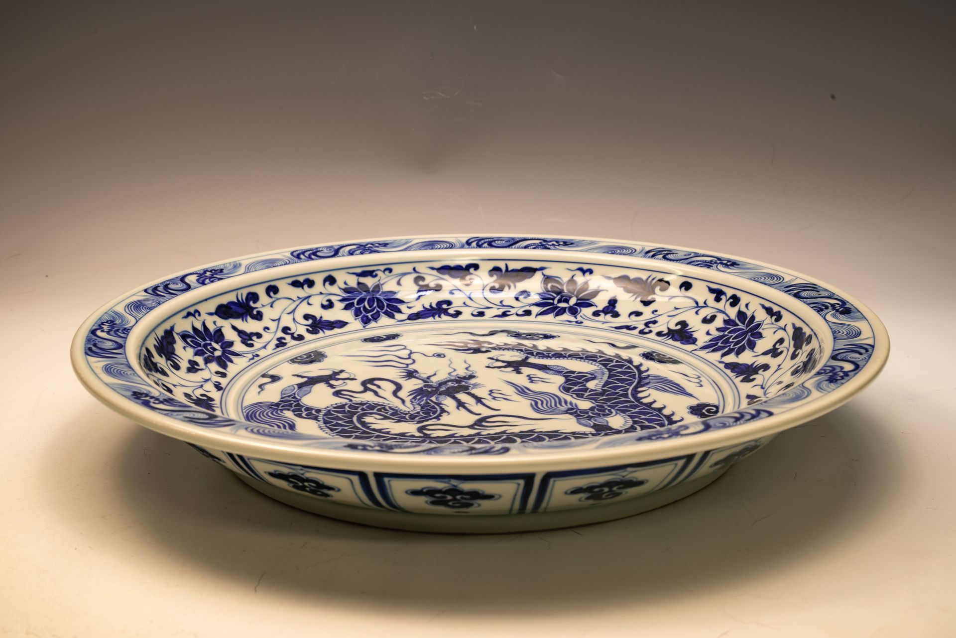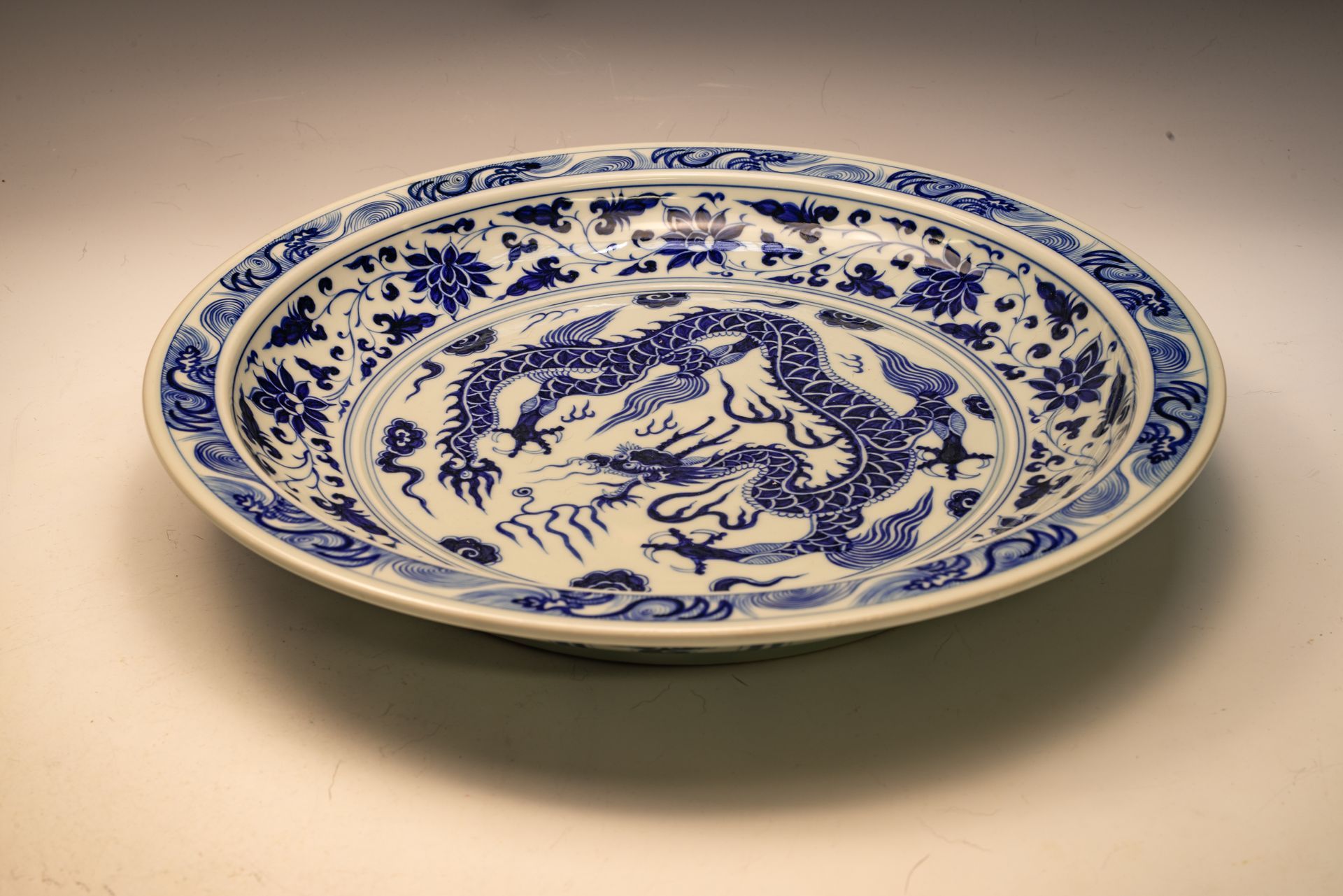この傑出した美術品は、元朝時代の青白磁皿で、炎の真珠を追う龍の精巧な描写が特徴です。厳選された素材を用い、その職人技は模範的です。職人たちは、独特の黒みがかった色合いが特徴の輸入サマリブルーコバルトを使用しています。特に注目すべきは、堆積と堆積効果によって釉薬の表面が乱れ、黒い斑点と銀色の反射が同時に現れていることです。この特定の輸入コバルトは500年以上入手不可能であったため、この観察結果はこの作品の真正性と年代を示す重要な指標となります。添付の写真は皿の内部を示しており、底部には漢字と中央に麒麟のモチーフが刻まれた二重の足環が見られます。さらに、素焼き層に剥がれが見られることから、この皿の歴史的重要性が伺えます。作品の直径は約14.5インチです。ppjrs