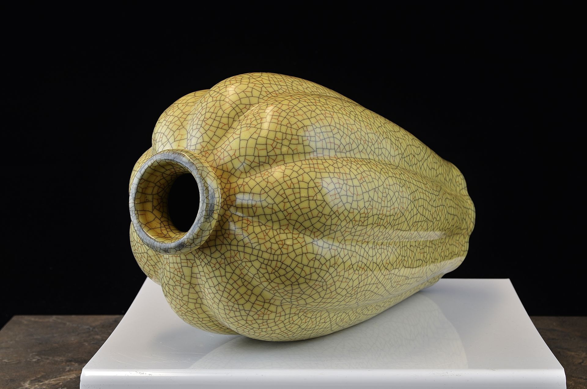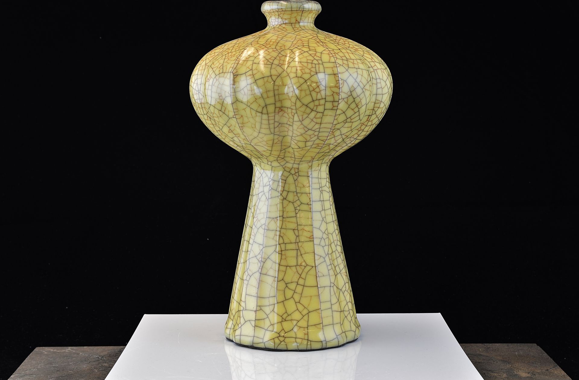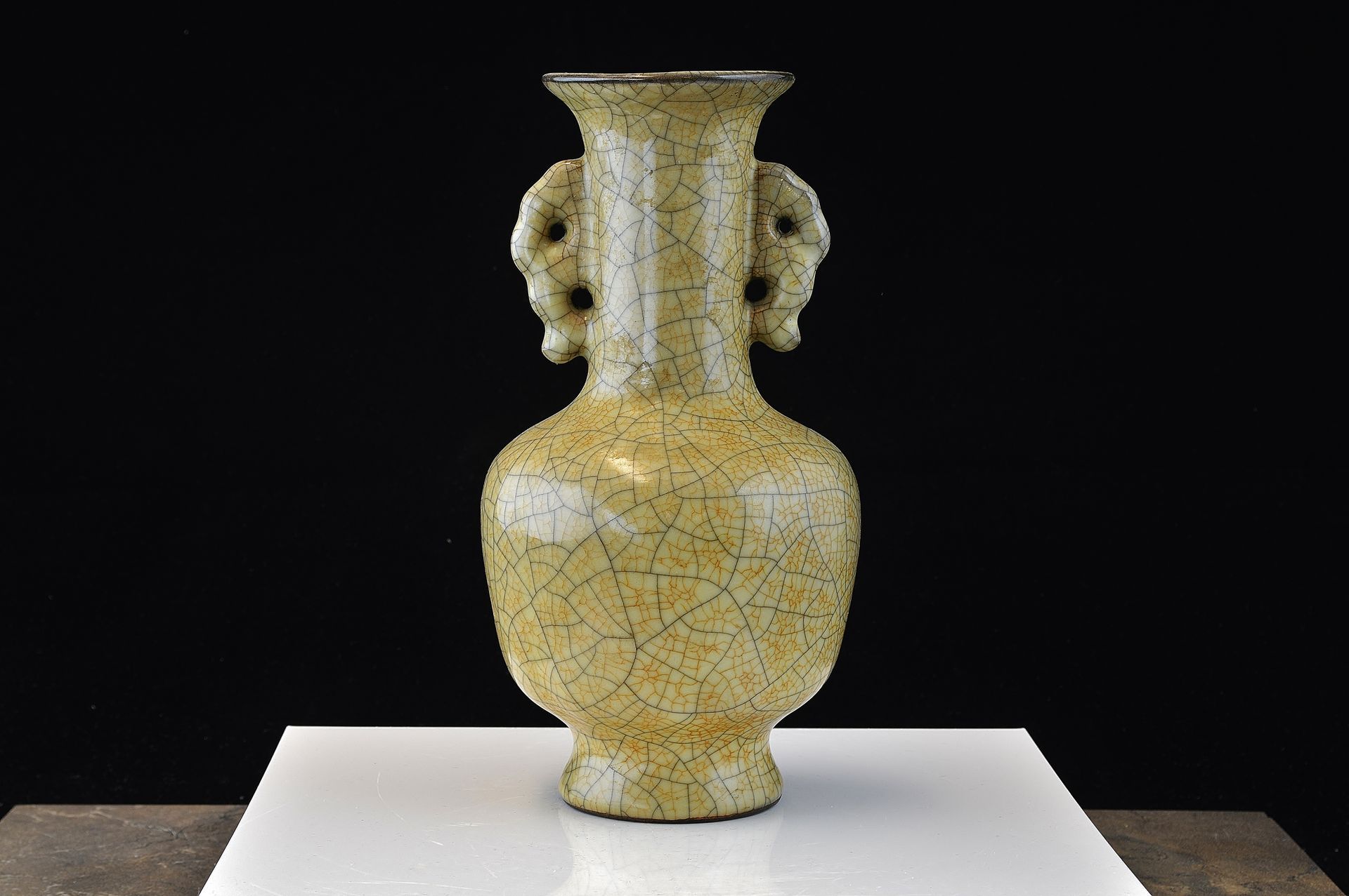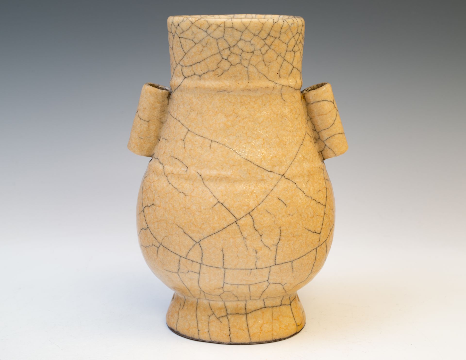 Southern Song / Yuan Dynasty Ge Kiln Hu-formed Vase with Tube Handles, likely produced in the early Southern Song Dynasty, exhibiting an imperfect firing process that resulted in a thicker glaze due to incomplete control over the techniques at the time. The vase features an iron foot and a coloration reminiscent of wheat. The Ge Kiln is regarded as the predecessor to other kilns during the transitional period from the Southern Song to the Yuan Dynasties. The approximate height of the vase is 8 1/2 inches. ppjrs