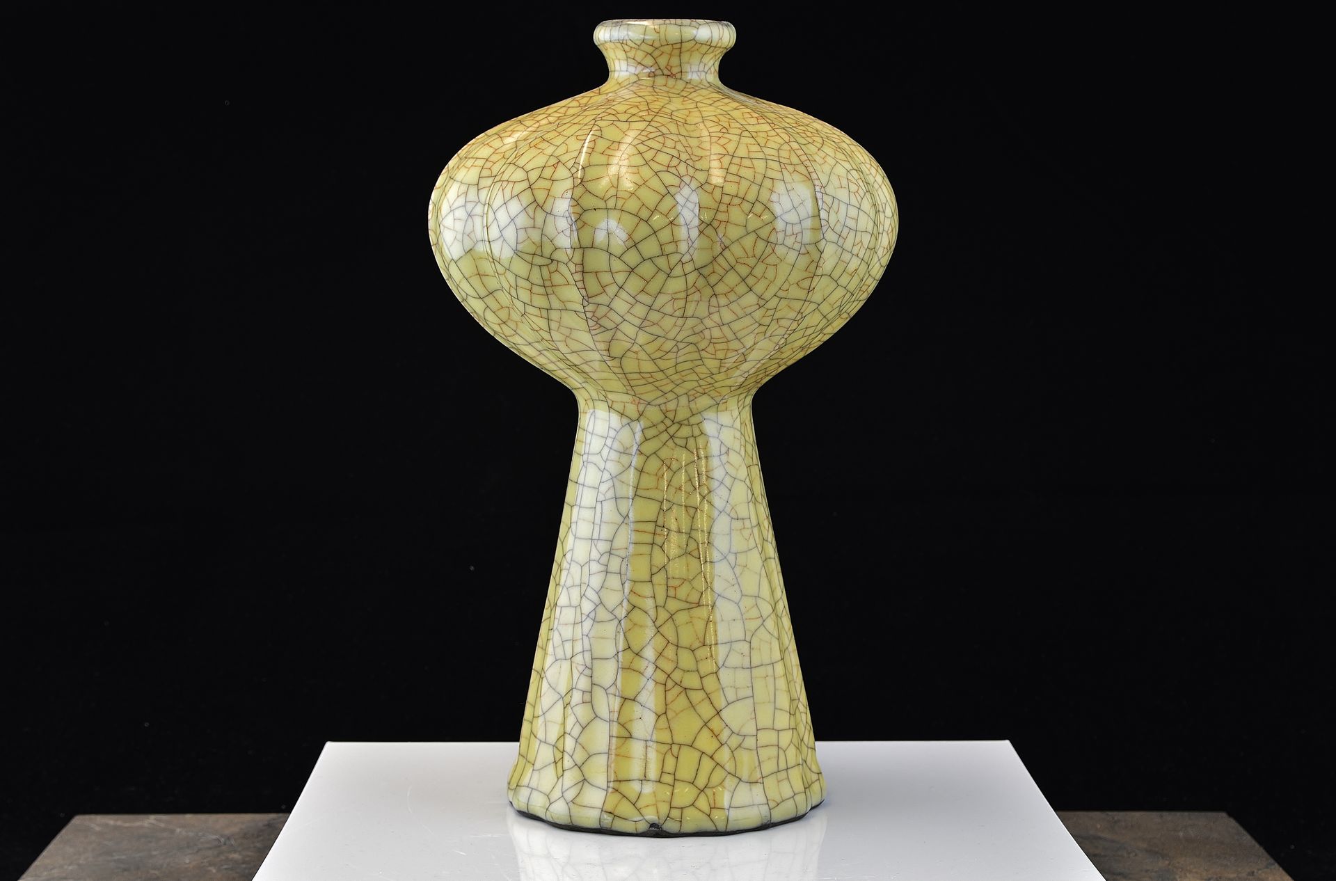 Song/Yuan Dynasty Ge Kiln Lobed Melon Form Vase on Pedestal, featuring a purple mouth, adorned with golden-threaded iron wire crackle and an iron foot. The coloration resembles that of wheat. The Ge Kiln is recognized as a distinguished elder kiln from the Southern Song through the Yuan Dynasties. When illuminated with a flashlight, the thinly glazed purple mouth reveals a subtle hint of purple. The vase measures approximately 9 7/8 inches in height. ppjrs