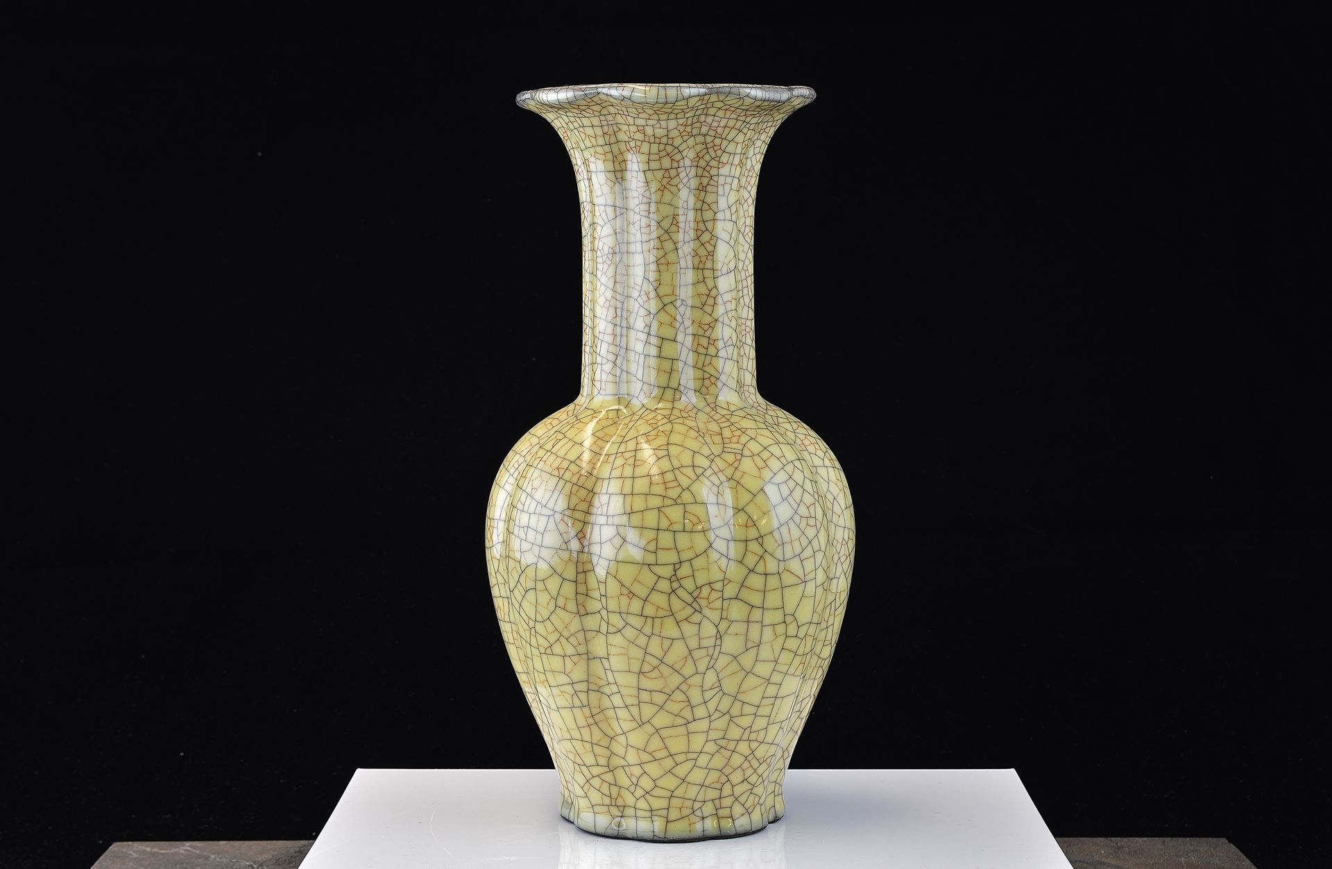 Song/Yuan Dynasty Ge Kiln Ge Ware Lobed Form Vase with Purple Mouth, exhibiting golden-thread iron wire crackle and an iron foot, bears a color reminiscent of wheat. The Ge Kiln is recognized as the elder kiln dating from the Southern Song to the Yuan Dynasties. The purple mouth becomes visible under flashlight illumination, revealing a subtle purple tint in areas where the glaze is thinned. This piece stands approximately 9.5 inches tall. ppjrs