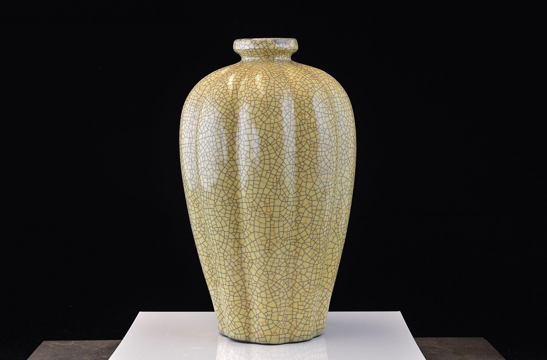 Song/Yuan Dynasty Ge Kiln Meiping Form Vase, featuring a lobed design, exquisite purple mouth, golden-thread cracked glaze, and an iron foot with a color reminiscent of wheat. The Ge Kiln is renowned as a preeminent kiln during the Southern Song through the Yuan Dynasties. The purple hue of the mouth becomes visible under flashlight illumination, where the glaze is notably thin, revealing a delicate tinge of purple. The vase stands approximately 9 3/4 inches in height. ppjrs