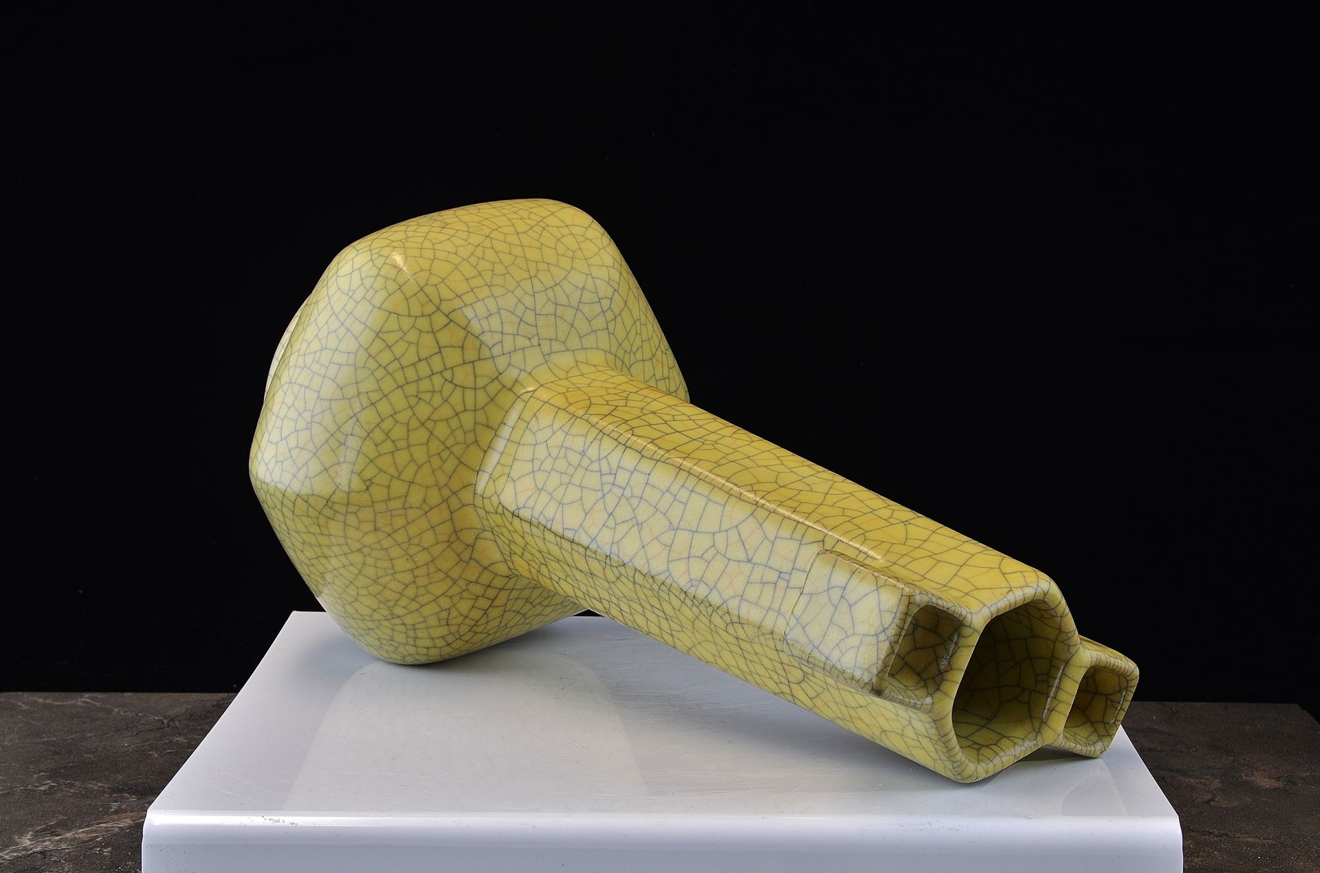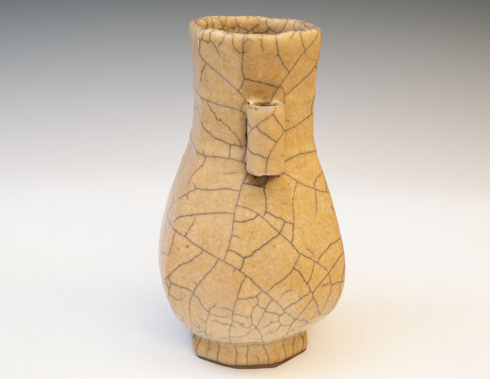 Southern Song / Yuan Dynasty Ge Kiln Octagonal Hu-Formed Vase with Tube Handles, likely produced in the early Southern Song period. The firing process of this piece displays inconsistencies; the glaze is notably thicker due to the kiln's operational limitations at that time. It features an iron foot and a color reminiscent of wheat. The Ge Kiln, often regarded as the "elder brother's kiln," is historically significant during the transition from the Southern Song to the Yuan Dynasties. This vase stands approximately 7 1/2 inches tall. ppjrs