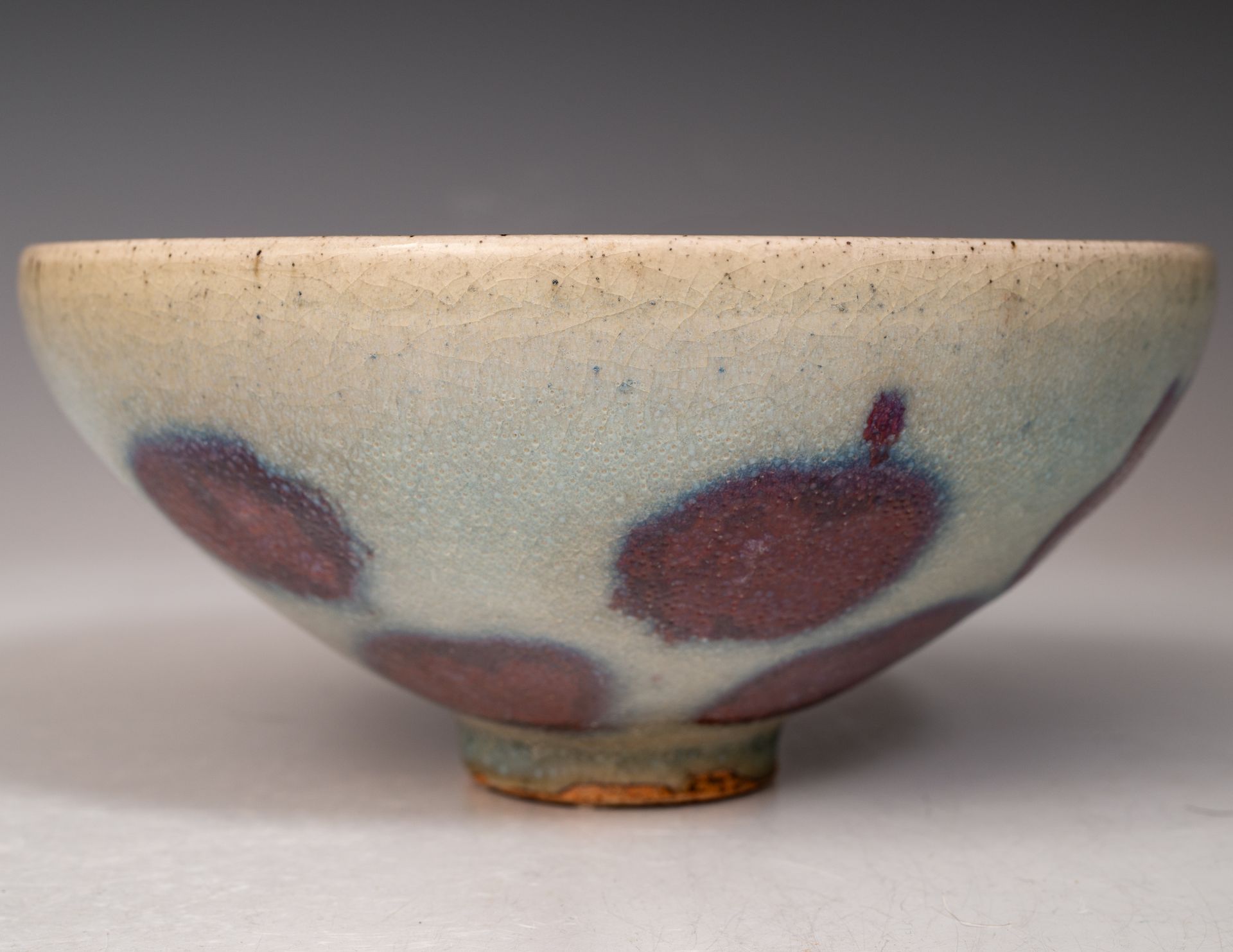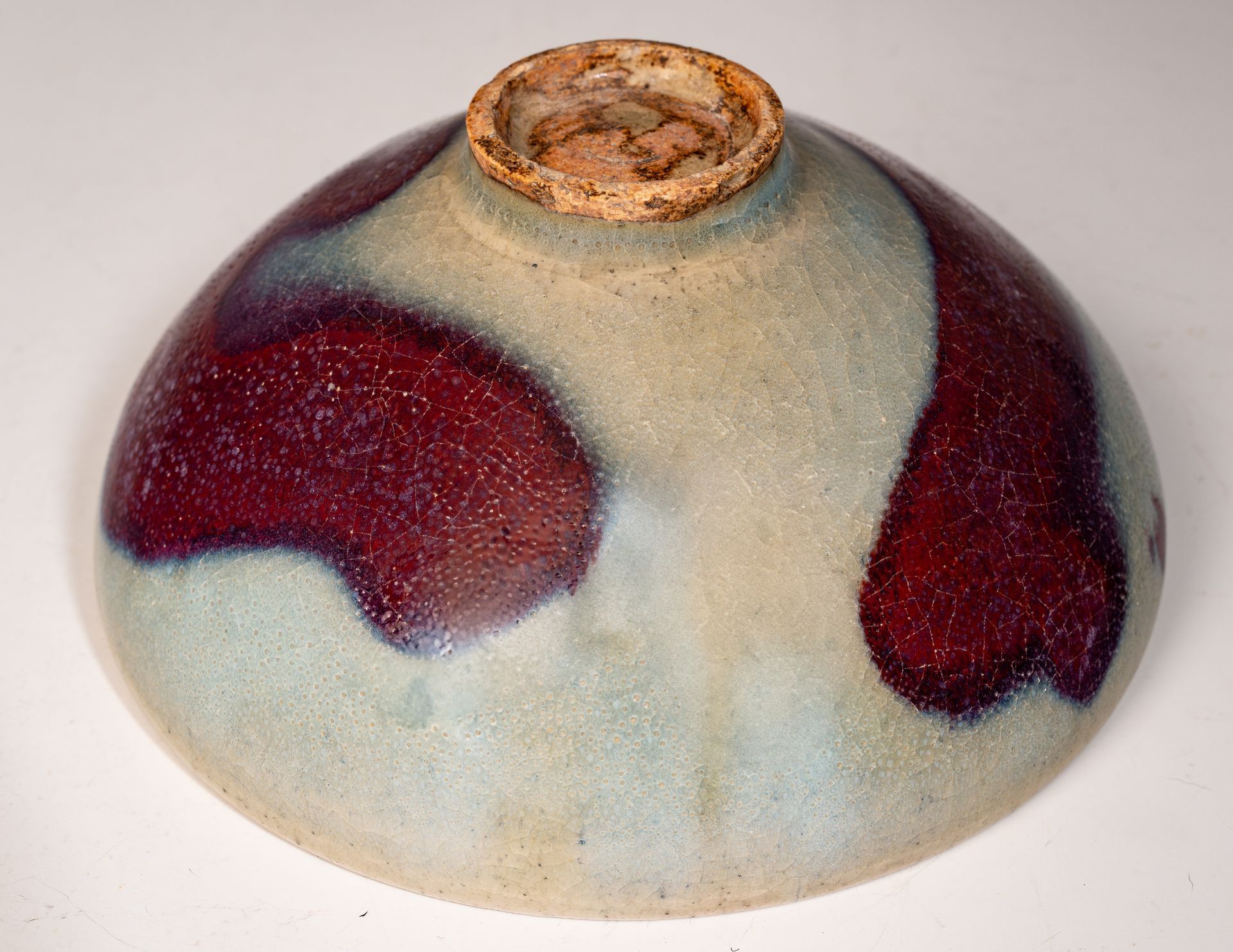 Song Dynasty. This bowl is decorated on the interior with a reddish purple splash against a blue ground and with a slight purple on the outside of the rim, and thins to a mushroom tone at the edge of the rim.