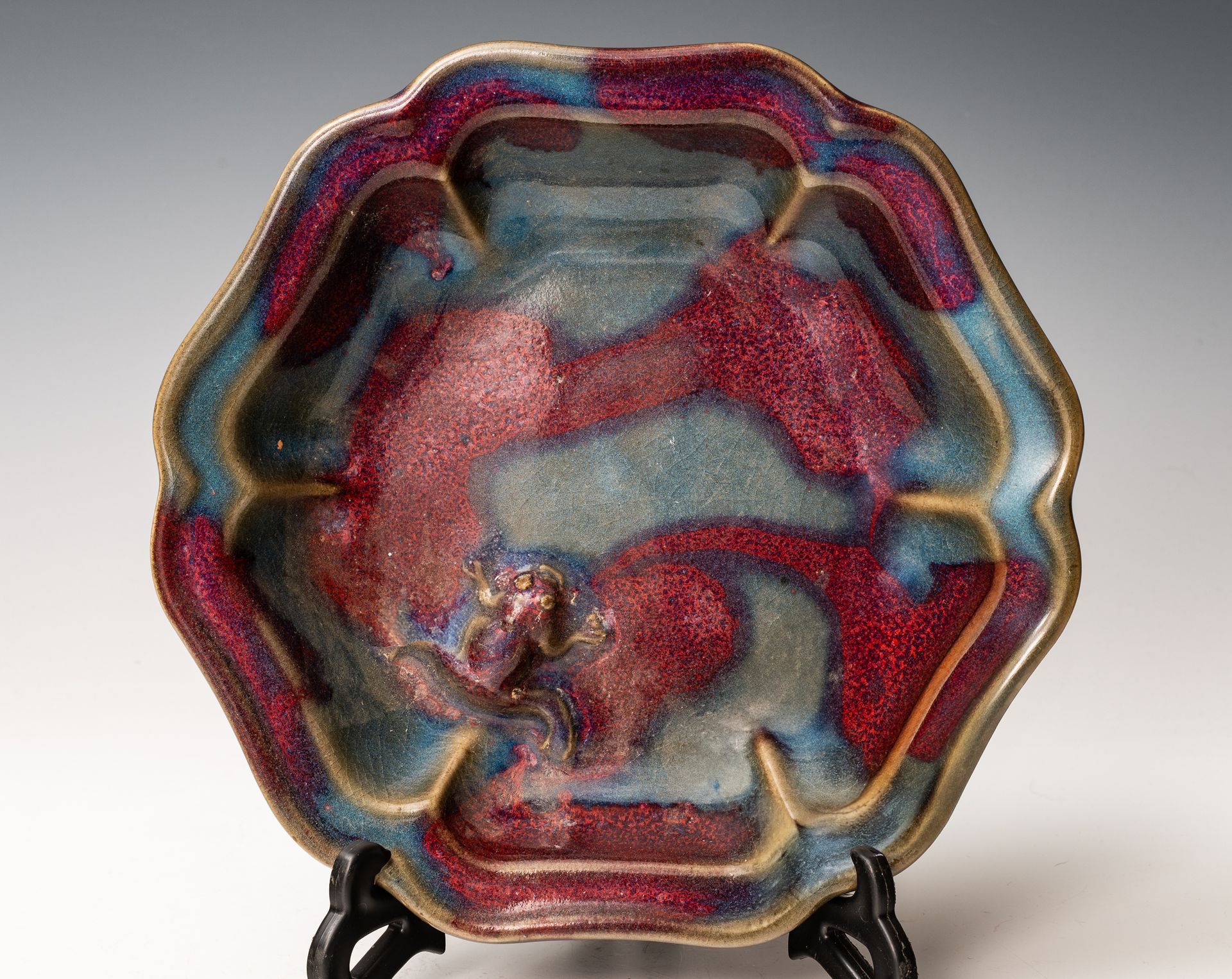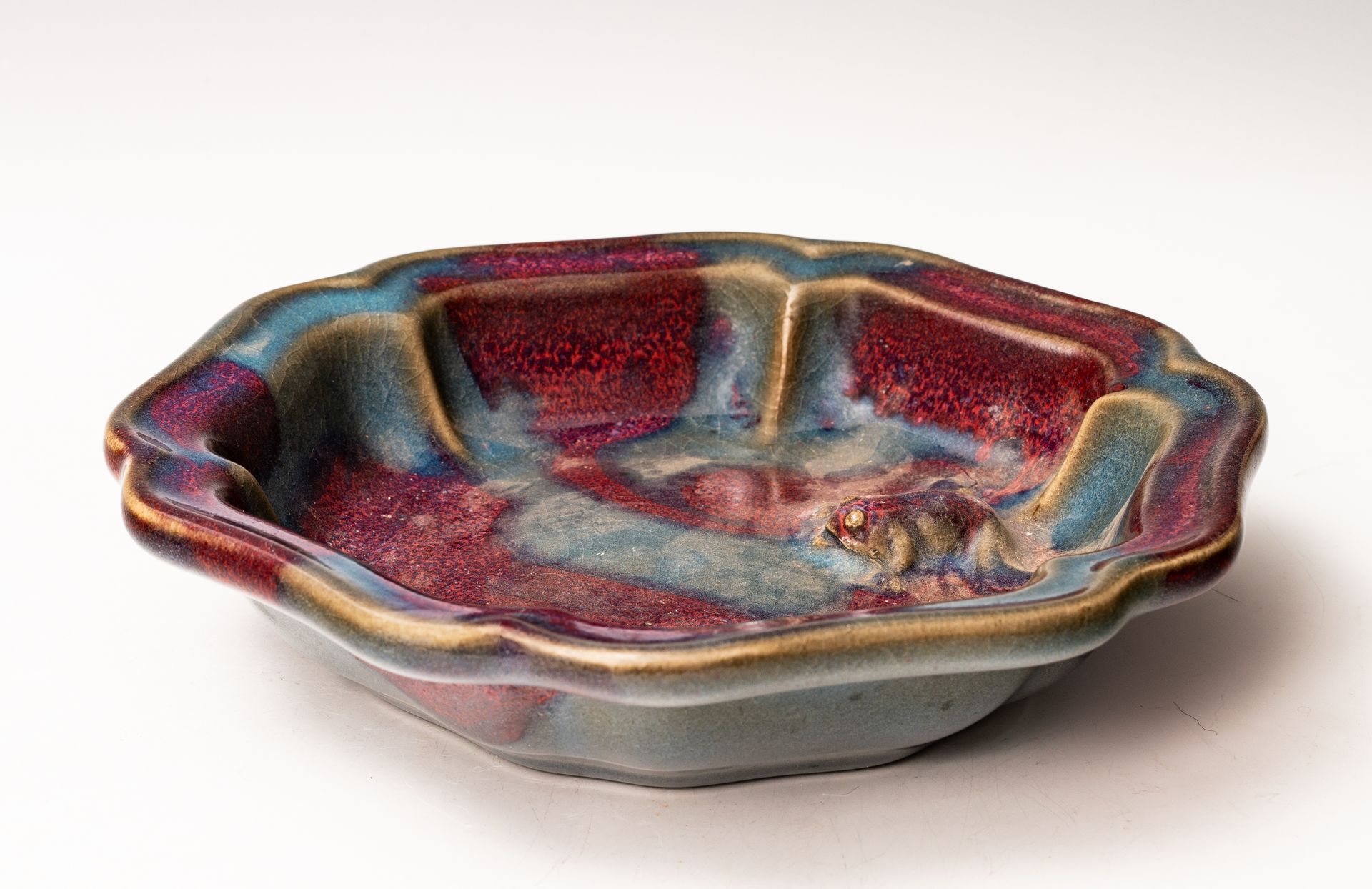 This remarkable octagonal brush washer from the Northern Song Dynasty features a vivid blue hue adorned with reddish-purple splashes on both the interior and exterior surfaces. Notably, a frog motif is rendered on the interior, enhancing its artistic appeal. The glaze elegantly thins, transitioning to a mushroom tone along the rim and edges. This exquisite piece measures 8 1/4 inches in diameter. ppjrs