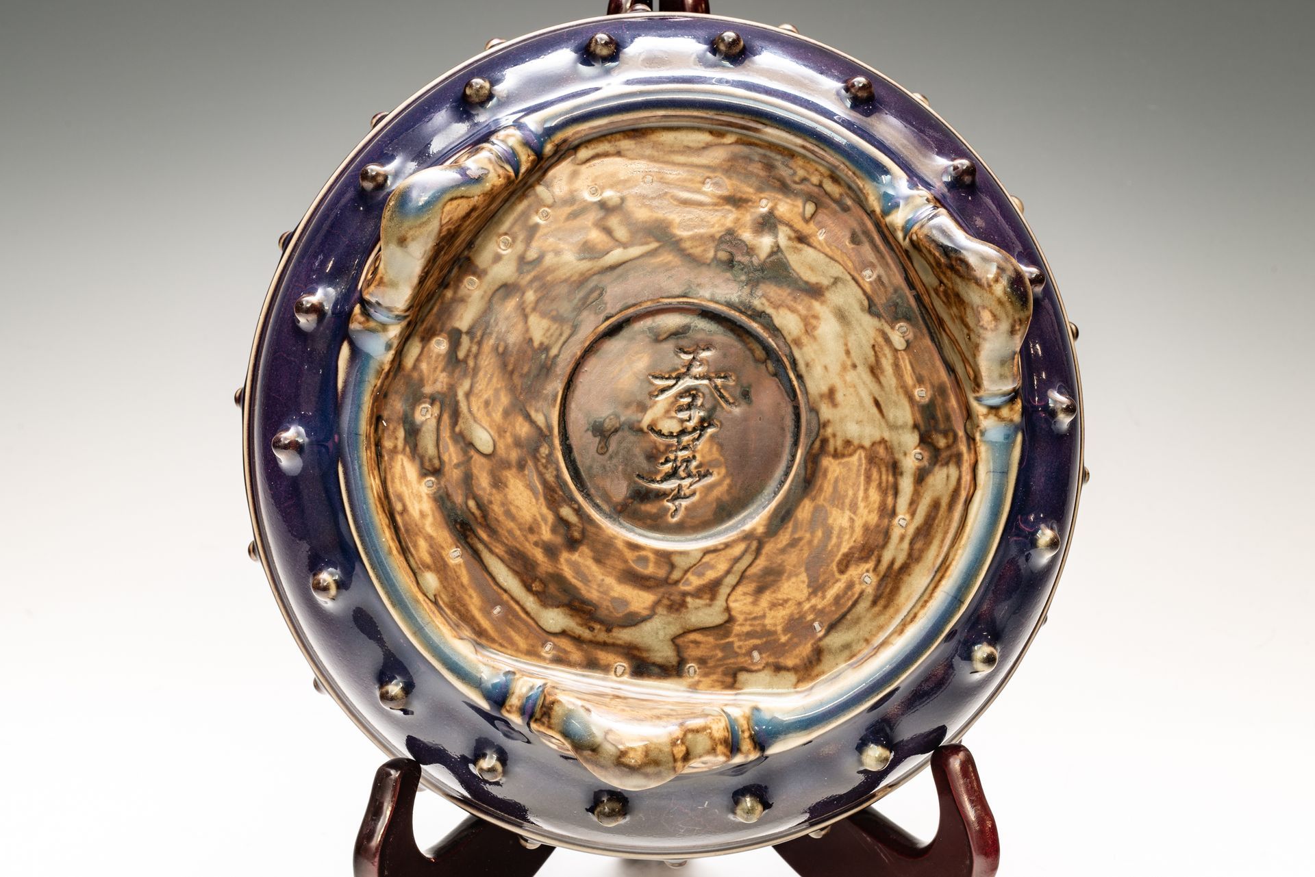 Jun Ware Brush Washer from the Song Dynasty exhibits a brownish slip with a purplish exterior and a robin egg blue interior, showcasing a delicate thinning of the glaze. The base of the bowl features a tadpole design, accompanied by subtle and fine crackling, along with two character marks. This piece measures approximately 8 3/4 inches in diameter. ppjrs