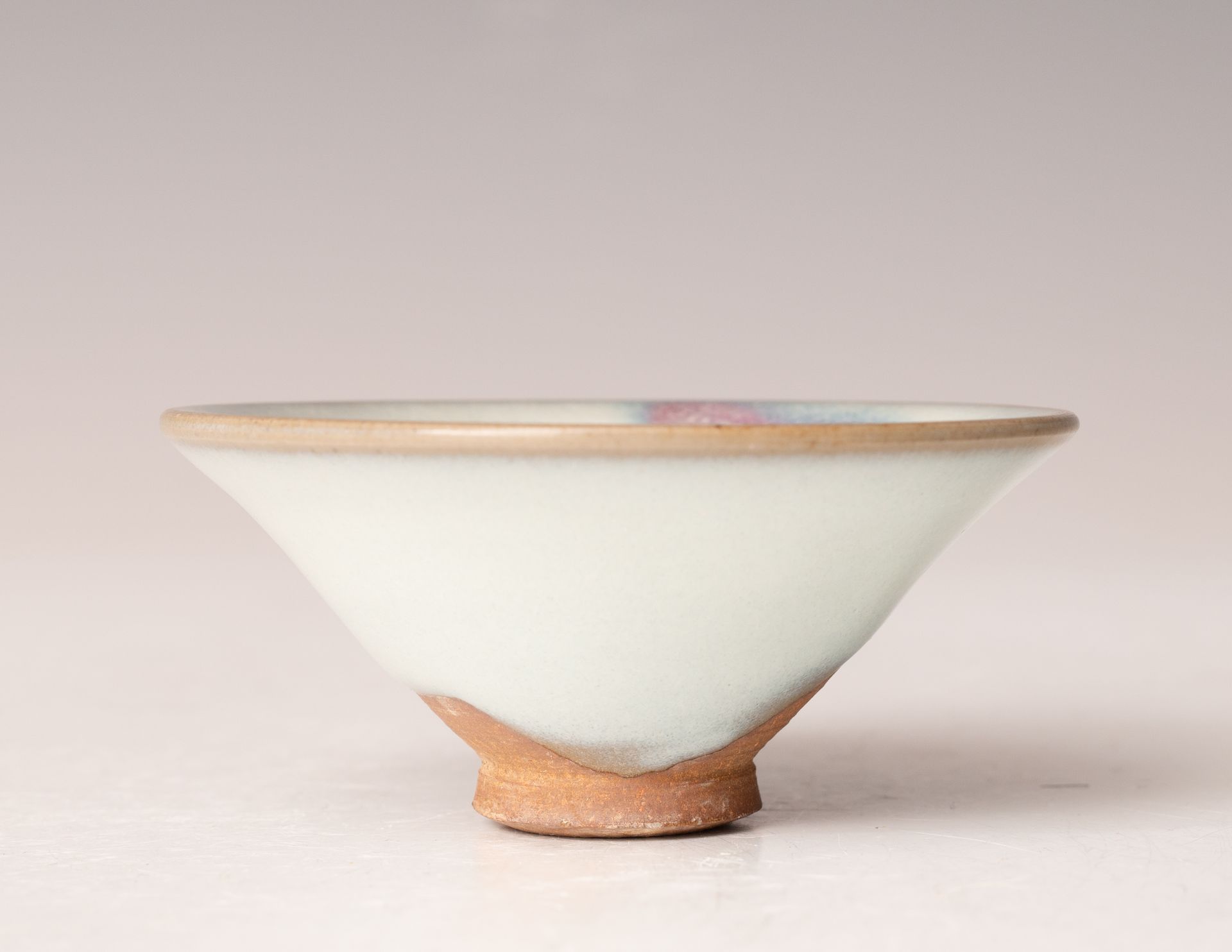 This Yuan Dynasty conical bowl, characterized by its pale bluish-white glaze, features purplish splashes both within the interior and slightly at the rim. The glaze delicately transitions to a mushroom tone at the rim. The bowl has a diameter of 3.5 inches. ppjrs
