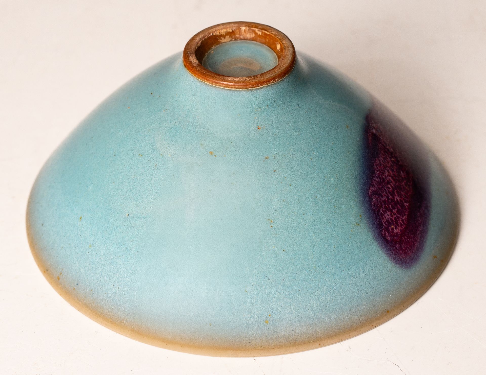 This Jun conical bowl from the Northern Song Dynasty features a distinctive robin egg blue glaze adorned with purple splashes both internally and externally. The glaze gradually transitions to a mushroom tone along the rim. The bowl measures 4 inches in diameter. ppjrs