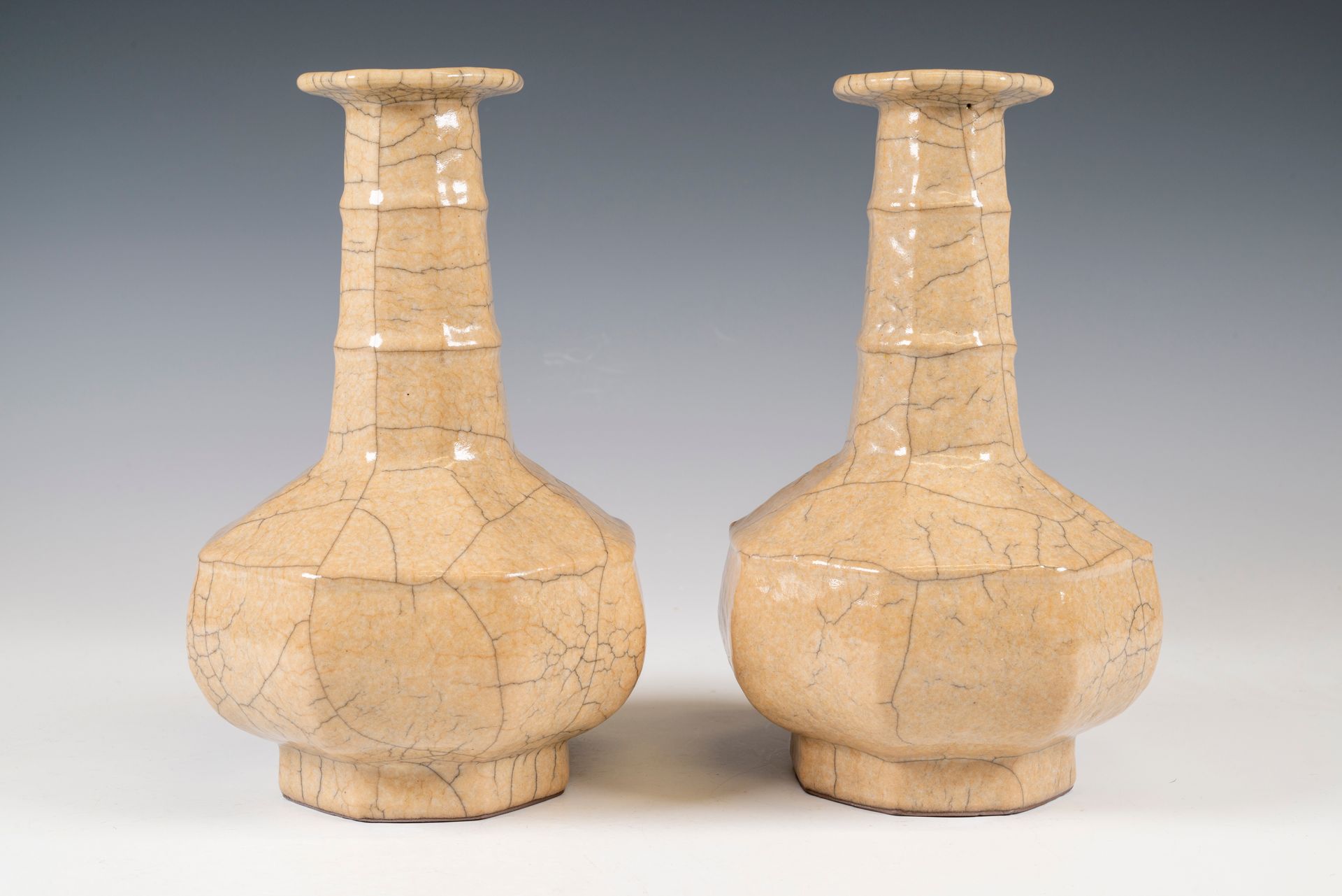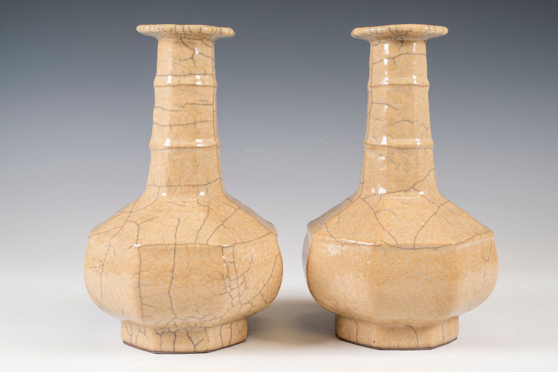 This exceptional pair of octagonal Ge ware vases represents one of the rarest forms of Fine Art ceramics ever documented. Characterized by a wheat-colored hue and delicately thin pottery, these vases exhibit meticulous craftsmanship. Notably, Ge ware is distinguished by its iron foot, observable on the foot ring, resulting from the use of light brown clay with a high iron content, which darkens upon firing. The surface crackle pattern is described as resembling iron wire interwoven with golden threads. The Ge kiln, often referred to as the elder brother's kiln, operated during the Southern Song Dynasty and into the Yuan Dynasty. These vases are highly regarded as rare artifacts likely produced in the Southern Song Dynasty, attributable to an earlier, less refined firing process that resulted in thicker glaze application due to evolving production techniques. Each vase measures approximately 8 3/4 inches in height, underscoring their significance in the history of Chinese ceramics. ppirs