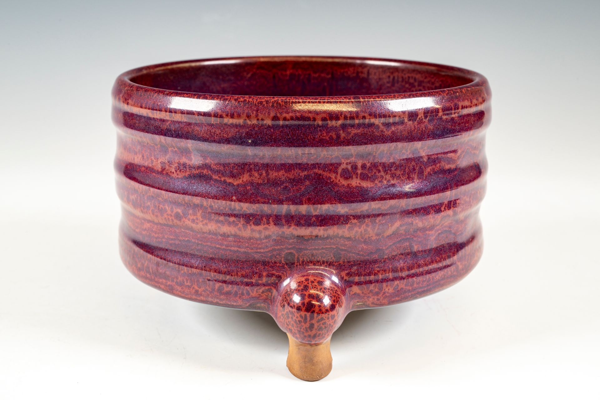 Northern Song Dynasty Jun Kiln Jun ware incense burner, featuring a three-legged design and adorned with a brownish slip. This piece showcases a striking reddish-purple glaze and is marked on the base. The dimensions are approximately 6 1/2 inches in diameter. ppjrs