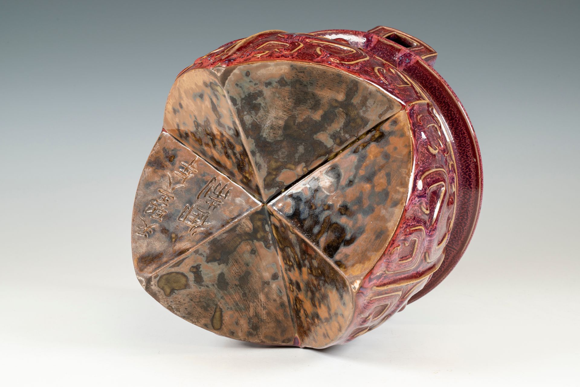 This exquisite piece from the early Ming Dynasty features a Jun octagonal form characterized by a purplish-blue glaze, accented with a reddish area beneath the lip on the exterior. The interior displays a delicate light blue hue, while a dark brown slip has been applied where the glaze thins, including a dark brown rim and edges. Notably, worm tracks are visible on the interior surface. The base is inscribed with three character marks. This vessel measures 9 1/8 inches in diameter. ppjrs