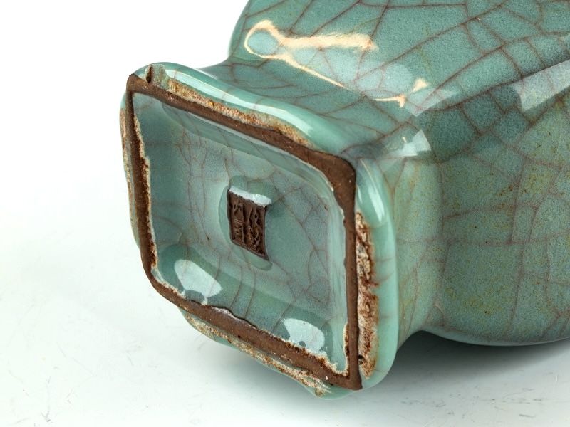 Southern Song Dynasty Tiger Handles Vase Masterpiece, Guan Yao Official Xiuneisi Kiln Imperial Mark period Guan ware Tiger Handle Vase that was done in the official Xiuneisi inner kiln. Has had several layers of thick greenish Glaze which was done with a thin body. This Beautiful Greenish very faint crackle glazed Curvy Rectangle Vase has the official government Guan mark on the base. Also has a iron foot from firing and the dark brown color from the brown clay they used. The Jin Armies drove the Imperial Court out from the Northern Song Dynasty they were driven south to Hangzhou in 1127A.D. and they setup the Southern Song Dynasty. measures approx 8 7/8" tall ppjrs