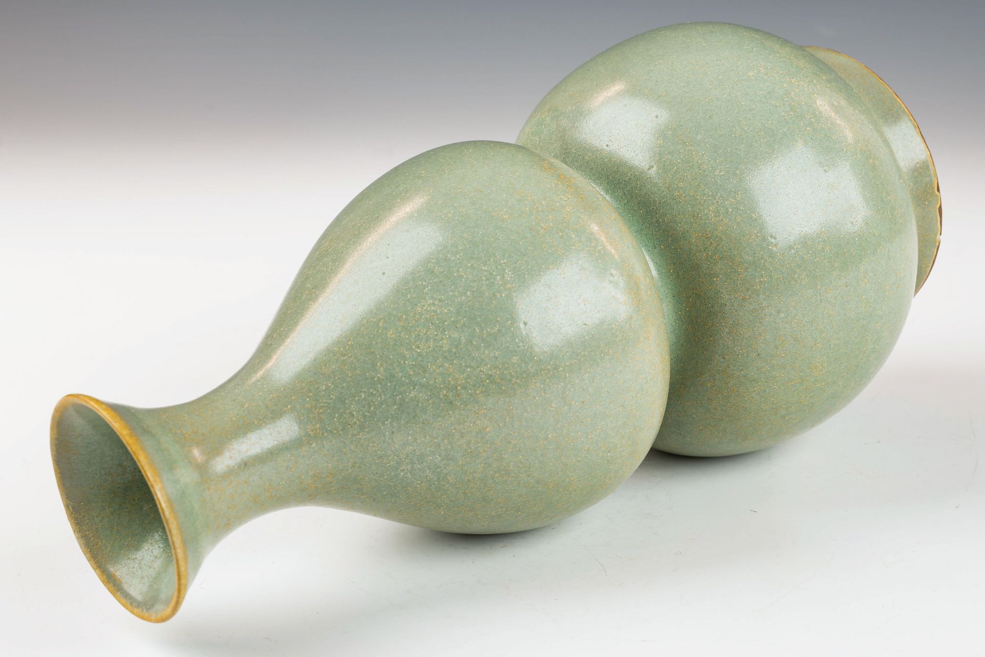 이 두 번째로 위촉된 공식 황실 여요 이중 박병은 중국에서 제작된 청자 중 가장 정교한 작품 중 하나입니다. 휘종 황제와 그의 궁중을 위해 특별히 제작된 이 병은 당시의 우아함과 화려함을 잘 보여줍니다. 이 병은 풍부하고 매끄러운 질감을 자랑하는 뛰어난 청자 유약이 특징이며, 미묘한 갈라짐 효과와 희미한 선이 특징입니다. 특히 유약 혼합물에 마노 가루가 섞여 있어 20배 확대경으로 관찰할 수 있으며, 미세한 현미경 사진에서 표면 전체에 마노 얼룩이 있음을 더욱 명확하게 확인할 수 있습니다. 마노 가루가 포함된 것은 휘종 황제의 위촉으로 제작된 공식 황실 여요만의 특징적인 특징입니다. 또한, 병의 테두리에는 불에 그을린 은띠가 장식되어 있습니다. 은띠의 불에 그을린 금박에는 기공이 있어 변색이 기공을 통해 스며들어 띠에 뚜렷한 검은 부식이 발생합니다. 꽃병 자체는 회백색을 띠는 몸체를 자랑하며, 굽는 과정에서 갈색빛을 띱니다. 높이 23cm(9¼인치)에 달하는 이 놀라운 이중 박 모양 꽃병은 휘종이 소장하고 있는 북송 여요(如窯) 도자기 컬렉션의 귀중한 유물입니다. ppjrs