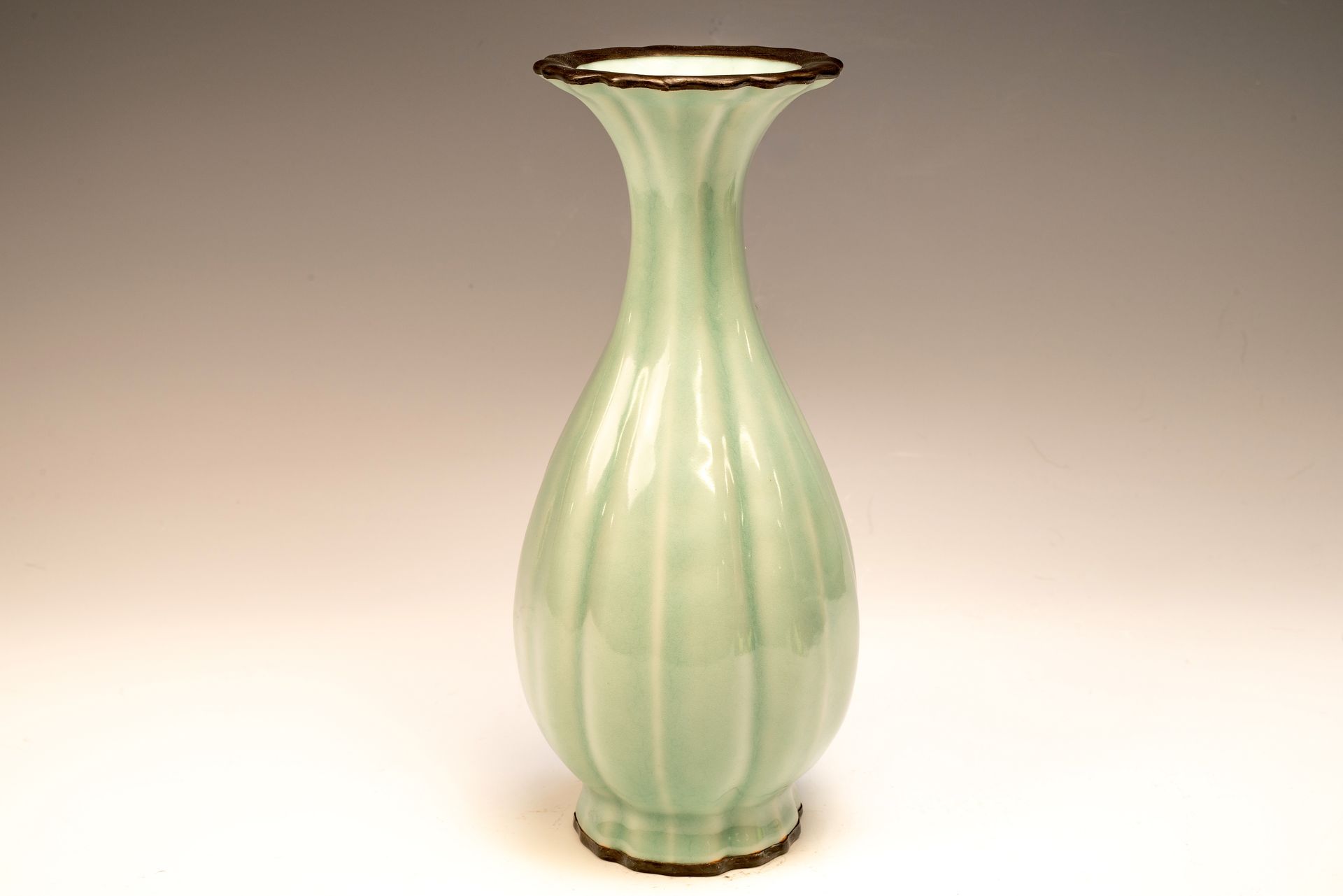 매우 중요한 두 번째 위임 공식 북송 왕조 여요 도자기 꽃병, 입술 주위에 단단한 은색 띠와 받침대에 단단한 금색 표시가 있음