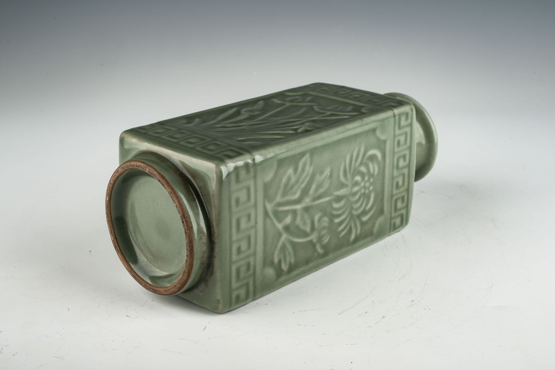 이 존경받는 두 번째 위촉 공식 황실 여요 사각병은 꽃, 대나무, 꽃, 연꽃으로 이루어진 정교한 장식을 특징으로 합니다. 이 병은 중국에서 제작된 가장 호화로운 청자 도자기를 대표하는 뛰어난 컬렉션의 일부입니다. 이 뛰어난 작품들은 휘종 황제와 그의 궁정을 위해 독점적으로 제작되었습니다. 이 청자병은 유약 구성에 희귀한 푸른색 마노를 첨가하여 더욱 풍부하고 매끄러운 질감을 특징으로 하는 놀라운 유약으로 유명합니다. 이 독특한 특징은 20배 확대경이나 현미경으로 쉽게 관찰할 수 있으며, 각 작품의 현미경 사진에서 볼 수 있듯이 마노 얼룩이 분명하게 드러납니다. 희귀한 푸른색 마노를 사용한 것은 휘종 황제의 후원으로 개발된 모든 공식 황실 여요 도자기의 특징이었습니다. 두 번째 위촉 공식 황실병은 흰색 몸체를 가지고 있으며, 구우면 갈색 색조로 변합니다. 이 놀라운 꽃병은 높이가 약 9 1/8인치이며 황제 휘종과 관련된 북송 왕조 공식 황실 여요 도자기 컬렉션에서 유래되었습니다. ppjrs