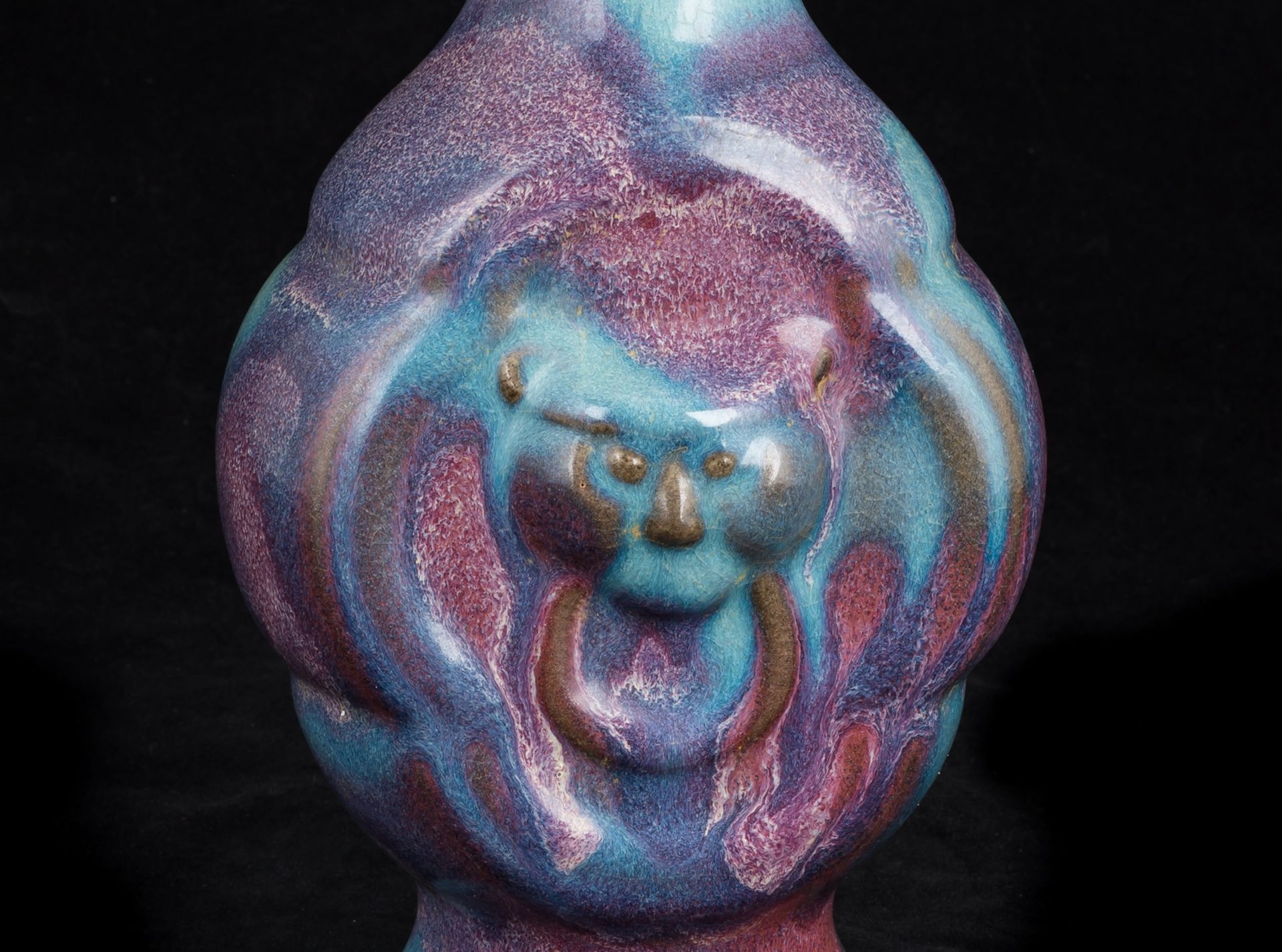 남송/원나라 갈요(枯窯) 갈요는 양 머리 모양의 손잡이 세 개, 밀을 연상시키는 색깔, 보라색 입, 그리고 철제 발이 특징인 대형 화병입니다. 철선 장식과 희귀한 뱀장어의 붉은 실이 찰랑거리는 소리를 냅니다. 남송과 원나라 시대에 형의 가마로 불리던 갈요는 뛰어난 장인 정신으로 유명합니다. 뛰어난 품질, 미적 감각, 그리고 높이 약 30cm(13 3/8인치)에 달하는 넉넉한 크기를 고려할 때, 이 화병은 조공용 도자기로 사용되었을 가능성이 높습니다. ppjrs