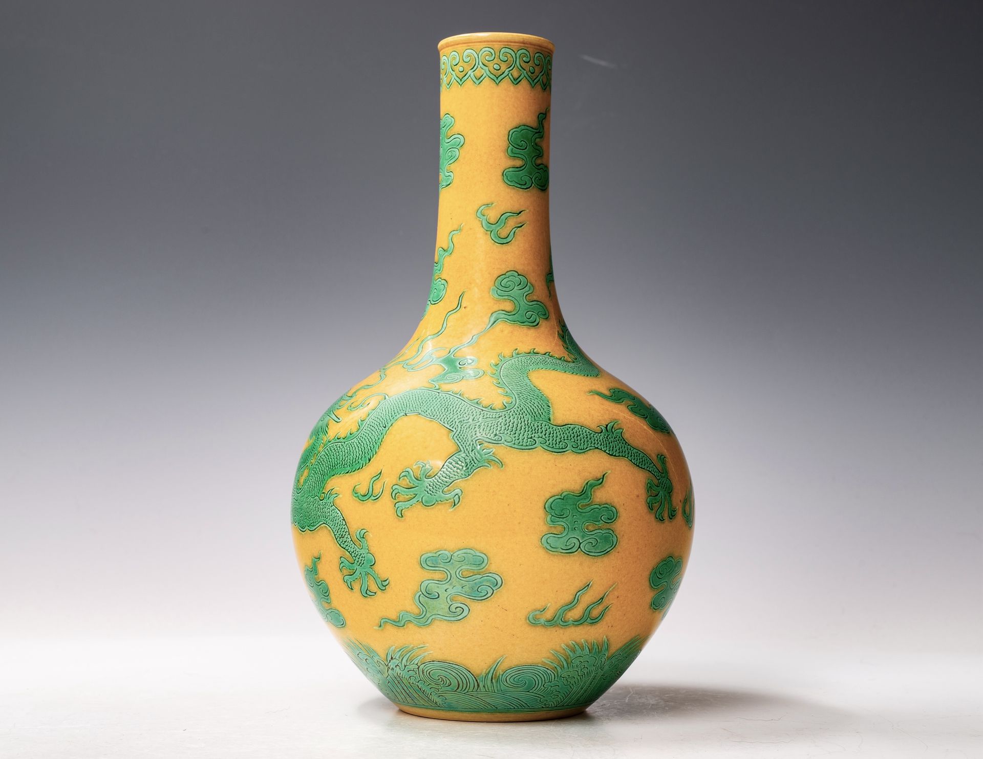 청나라 황실 가경 문양과 시대별 미평병, 황토색 바탕, 녹색 법랑으로 조각한 오룡, 청나라
