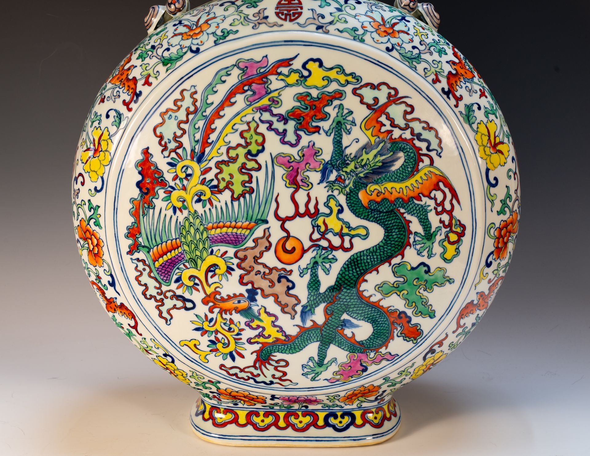 청나라 옹정제(雍正帝)의 두채(頭菜)는 매우 큰 크기로, 구름 무늬 가운데 용과 봉황 문양이 새겨져 있습니다. "두채"라는 용어는 "대비되는 색채"를 의미하며, 옹정제 시대에는 매우 드물었던 법랑 양식인 파미에 로즈(Famille Rose) 팔레트를 사용했음을 나타냅니다. 이 병은 우아하게 디자인된 날치 손잡이를 자랑하며, 표면에는 박쥐, 모란, 꽃무늬가 장식되어 있습니다. 바닥에는 청화로 칠해진 육자 옹정 인장이 새겨져 있습니다. 또한, 비스킷의 박리 현상은 이 병의 역사적 중요성과 진위를 증명합니다. 병의 높이는 약 54cm(22 3/4인치)입니다. ppjrs