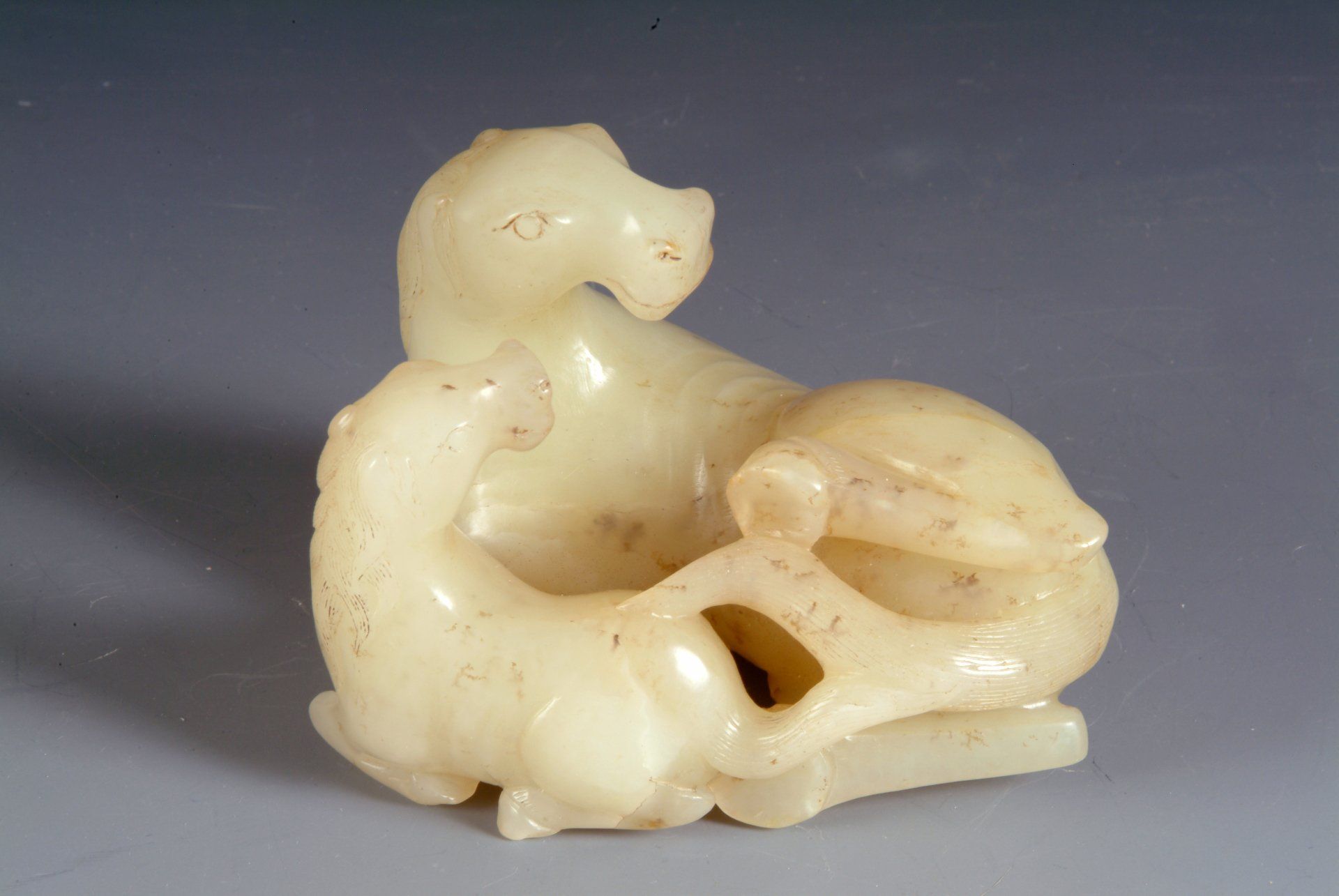 이 정교한 유물은 정교하게 조각된, 뿔이 달린 신화 속 짐승으로, 고품질 백옥을 사용하여 정교하게 조각되었습니다. 이 작품은 머리를 우아하게 뒤로 젖힌 짐승의 모습을 하고 있으며, 등에는 뿔이 달린 봉황이 눈에 띄게 새겨져 있습니다. 이 조각에 사용된 반투명한 옥은 뛰어난 품질을 자랑하며, 정교한 디테일은 장인의 뛰어난 솜씨를 보여줍니다. 특히, 이 조각품은 해부학적 디테일과 입 주변과 꼬리를 따라 뚜렷한 갈색 내포물(inclusions)을 포함하고 있어 미적 매력을 더욱 돋보이게 합니다. 내포물 패턴과 전반적인 조각 양식은 제작 시기를 짐작할 수 있게 해주며, 이 작품이 당나라 시대로 거슬러 올라간다는 것을 시사합니다. 옥의 길이는 약 13.6cm(5 1/4인치)입니다.