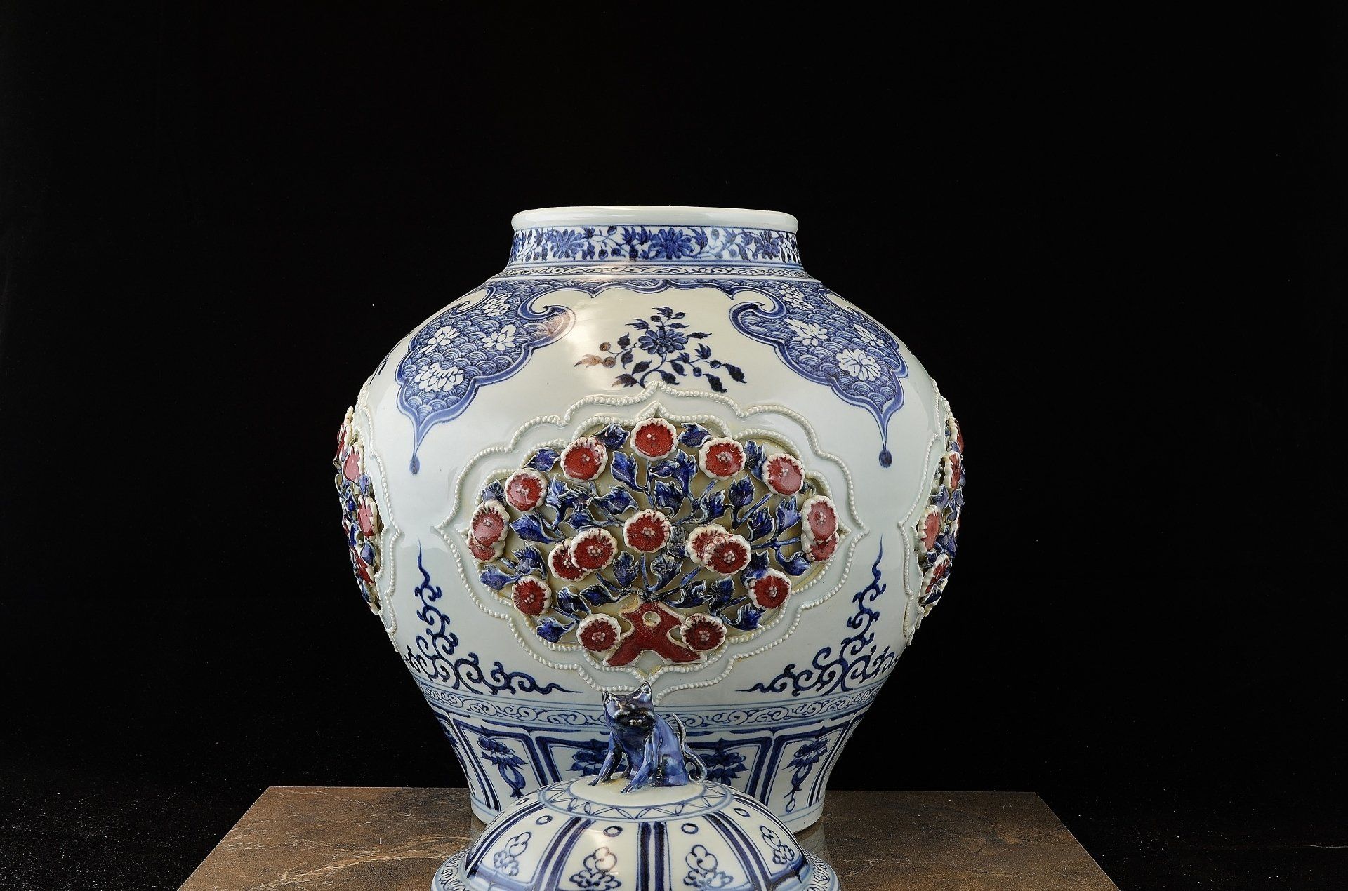 꽃과 잎사귀 모티프로 정교하게 장식된 청화홍원 항아리는 독특한 고양이 장식을 자랑합니다. 이 작품은 한 쌍의 항아리 중 하나입니다. 수입 사말리 블루 코발트로 제작된 코발트는 독특한 검은색을 띱니다. 유약 표면에 나타나는 쌓이고 쌓인 듯한 효과는 중국산 코발트에서 나타나는 갈색이 아니라 검은 반점이나 은빛 광택을 띱니다. 이 특별한 수입 코발트는 500년 넘게 구할 수 없었기 때문에 이러한 특징은 원산지를 증명합니다. 또한, 비스킷에 박편이 있는 모습은 상당한 세월의 흔적을 보여줍니다. 항아리의 높이는 약 45cm입니다. ppjrs