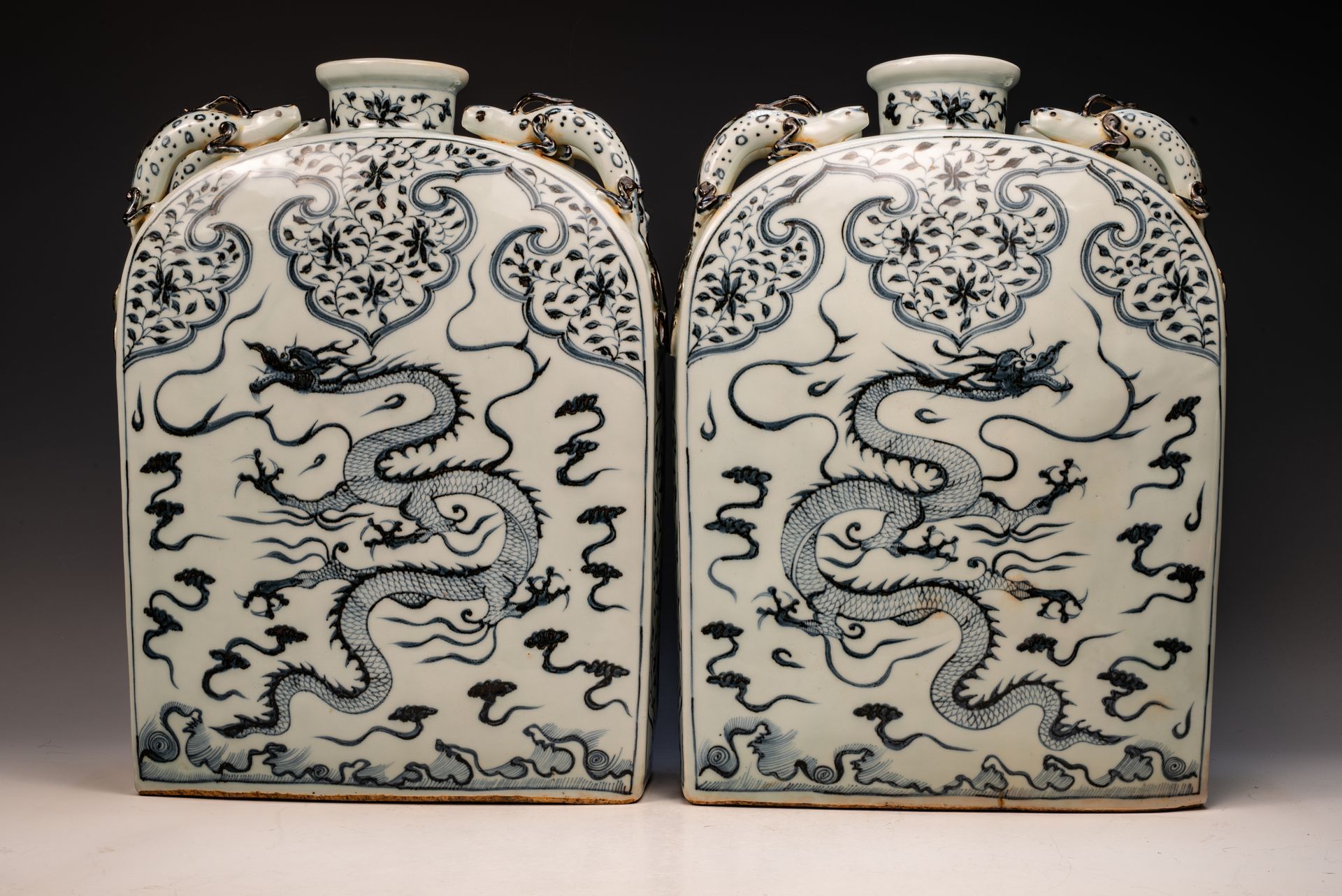 **구름과 물 속에 청화백룡이 두드러지게 표현된 원나라 병 한 쌍, 모란 장식, 그리고 네 개의 화려한 용 손잡이** 이 정교한 병은 원나라의 첨단 회화 기법을 잘 보여줍니다. 독특한 검은 빛깔로 유명한 수입 사말리 블루 코발트로 정교하게 제작되었습니다. 코발트의 농도는 독특한 쌓임 효과를 유발하여 유약 표면과 상호 작용할 때 검은 점이나 은빛 하이라이트가 나타납니다. 코발트는 5세기 이상 수입되지 않았기 때문에 이러한 특징은 병의 진위를 보여주는 중요한 지표입니다. 또한, 비스킷에 검은 점과 박편이 존재한다는 사실은 이 병이 상당히 오래되었음을 더욱 뒷받침합니다. 각 병의 높이는 약 40cm입니다. ppjrs