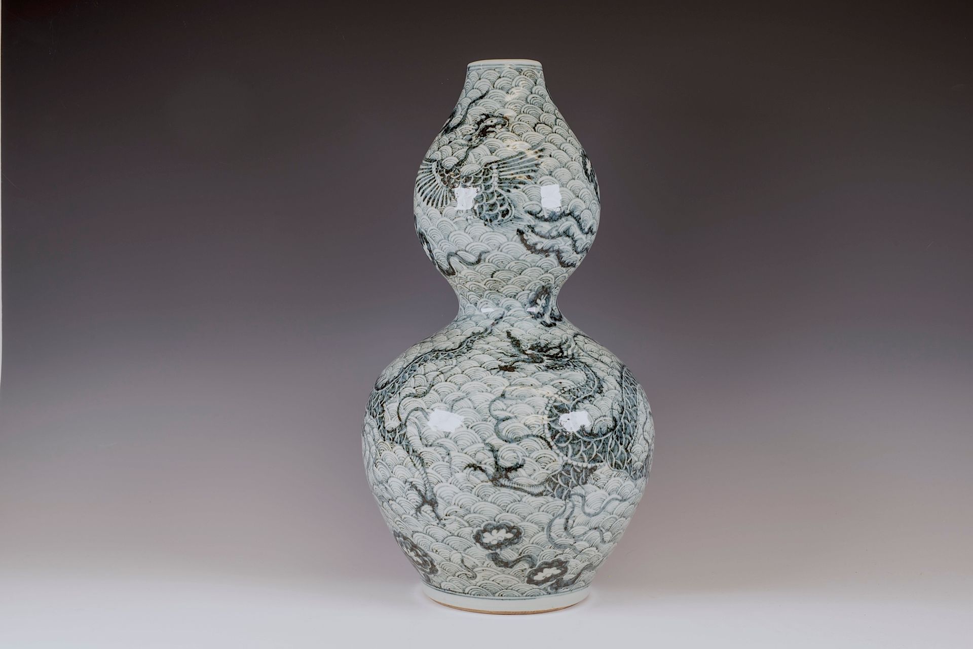 원나라 청화쌍박병은 두 마리의 용이 물 위를 역동적으로 질주하는 모습과 구름 사이를 날아오르는 두 마리의 봉황이 어우러진 놀라운 유물입니다. 이 특별한 작품은 독특한 흑색으로 유명한 수입 사말리 블루 코발트로 제작되었습니다. 정교한 쌓기 기법으로 인해 표면에 검은 반점뿐만 아니라 은빛 반사가 나타나 중국산 코발트의 전형적인 갈색 톤과는 차별화됩니다. 또한, 이 병은 녹색을 띠는데, 이는 이 코발트의 특수한 광물 성분으로 인해 진품임을 증명하는 특징입니다. 이러한 특징과 연대는 매우 중요한데, 이 코발트는 500년 이상 전에 생산된 적이 없기 때문입니다. 또한, 비스킷의 박편화 현상은 이 병이 상당히 오래되었음을 더욱 뒷받침합니다. 이 정교한 병의 전체 높이는 약 18 5/8인치입니다. ppjrs