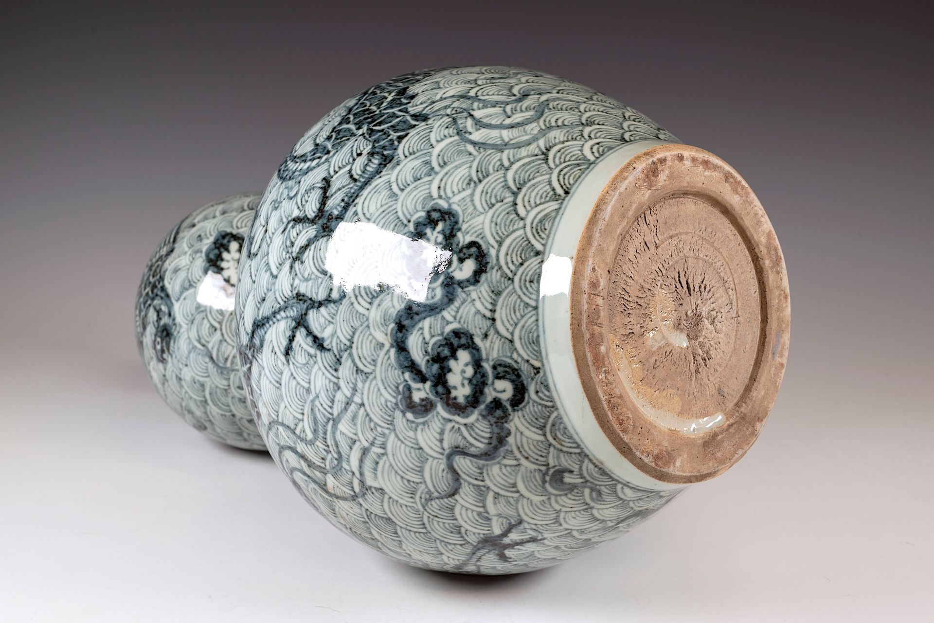 이 뛰어난 미술품은 원나라 청화백자 항아리로, 불타는 진주를 쫓는 용이 묘사되어 있습니다. 장인들은 독특한 흑색 기조를 지닌 수입 사말리 블루 코발트를 사용했습니다. 특히, 유약 표면이 쌓이고 쌓이는 현상이 나타나면서 검은색 반점이나 은빛 반사가 나타나는데, 이는 중국산 코발트에서 흔히 볼 수 있는 갈색과는 대조적입니다. 이러한 관찰 결과는 이 작품의 연대를 보여주는 중요한 지표가 되는데, 이 수입 코발트는 500년 이상 사용되지 않았기 때문입니다. 첨부된 사진은 항아리의 내부를 보여주는데, 두 부분으로 구성되어 있는데, 이는 많은 원나라 항아리에서 흔히 볼 수 있는 특징입니다. 또한, 비스킷의 박리 현상은 항아리의 역사적 연대를 뒷받침합니다. 항아리의 높이는 약 25cm입니다. ppjrs