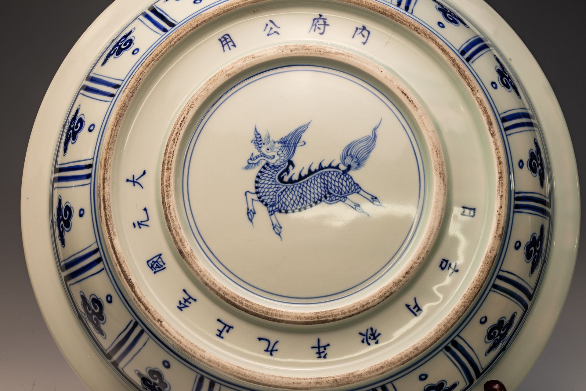 이 고귀한 미술품은 청화백자 원나라 접시로, 용 한 마리가 불타는 진주를 쫓는 정교한 묘사로 유명합니다. 엄선된 재료를 사용한 장인의 솜씨는 탁월합니다. 장인들은 독특한 흑색 기조가 특징인 수입 사말리 블루 코발트를 사용했습니다. 특히 유약 표면에 쌓인 듯한 무늬가 검은 반점과 은빛 반사를 드러내는 것이 특징입니다. 이 특별한 수입 코발트는 500년 넘게 접할 수 없었기 때문에, 이러한 관찰은 작품의 진위성과 연대를 판단하는 중요한 지표가 됩니다. 첨부된 사진은 접시의 내부를 보여주며, 바닥에는 한자가 새겨진 이중 발받침과 중앙에 기린 문양이 새겨져 있습니다. 또한, 비스킷 층 내부의 박리 현상은 이 접시의 상당한 역사적 중요성을 시사합니다. 작품의 지름은 약 14 1/2인치입니다. ppjrs