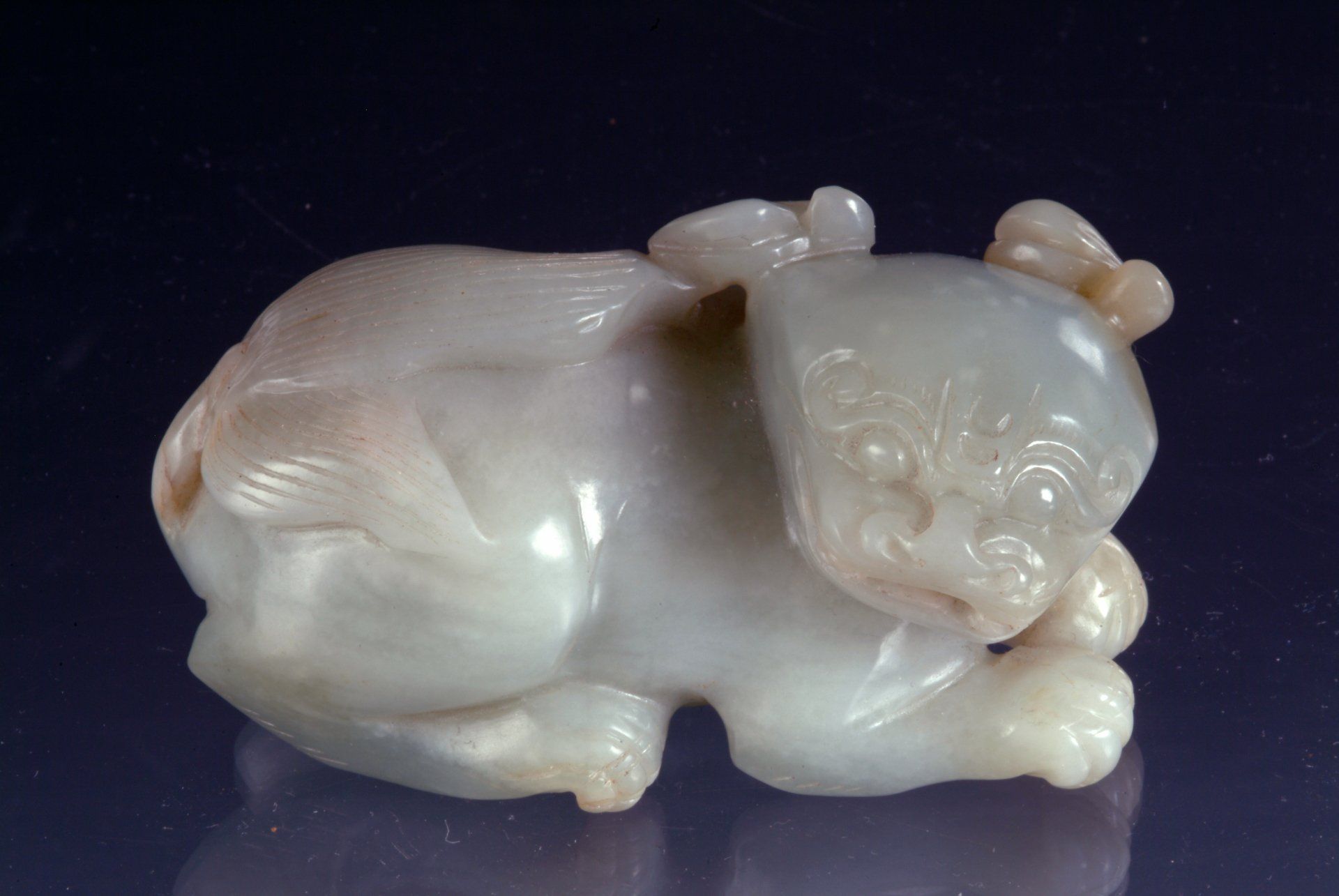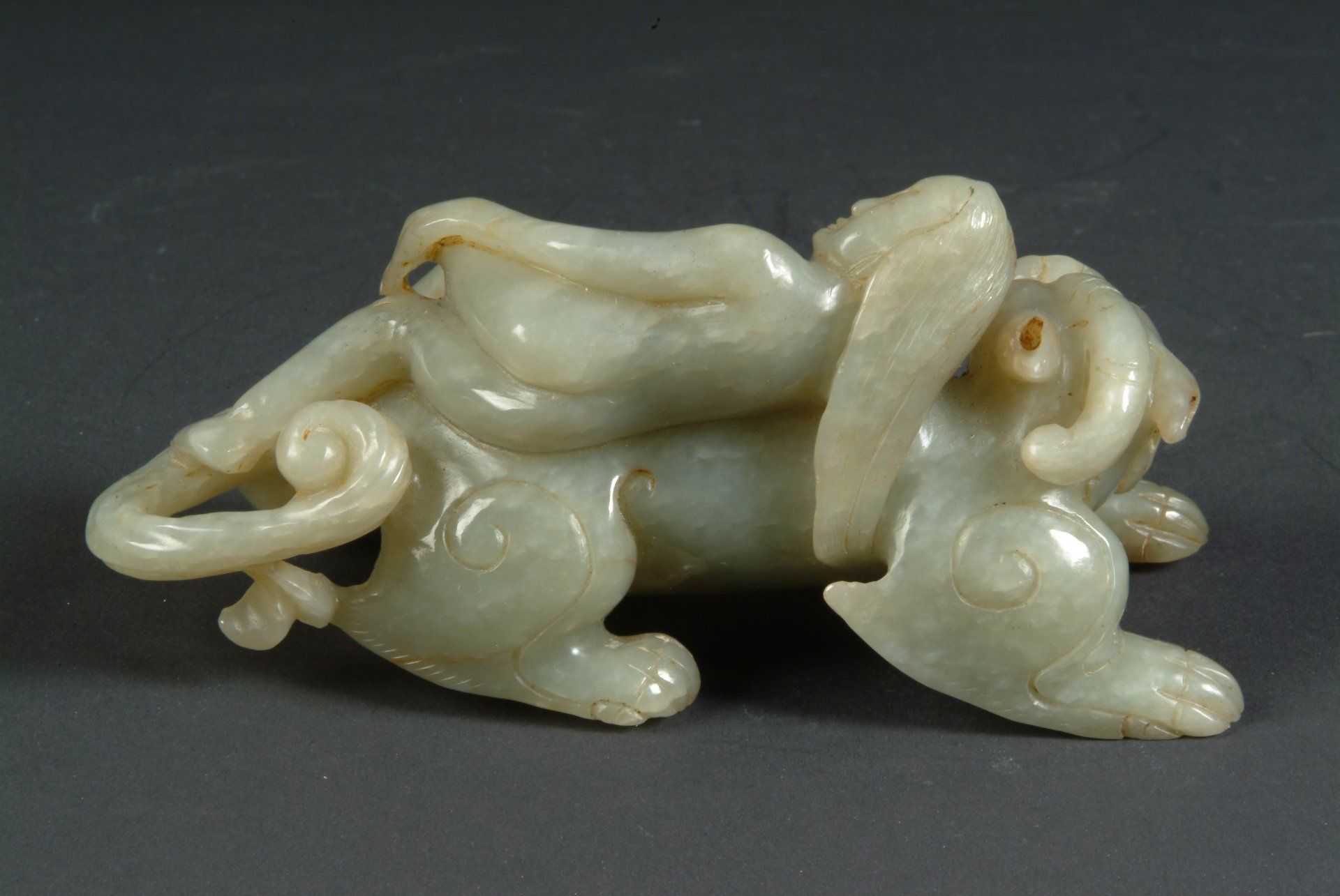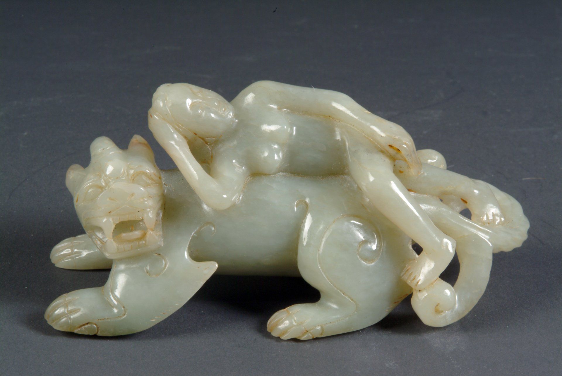Ming Dynasty Pale Jade Celadon Reclining Mythical Creature and Representation of the Five Poisonous Creatures