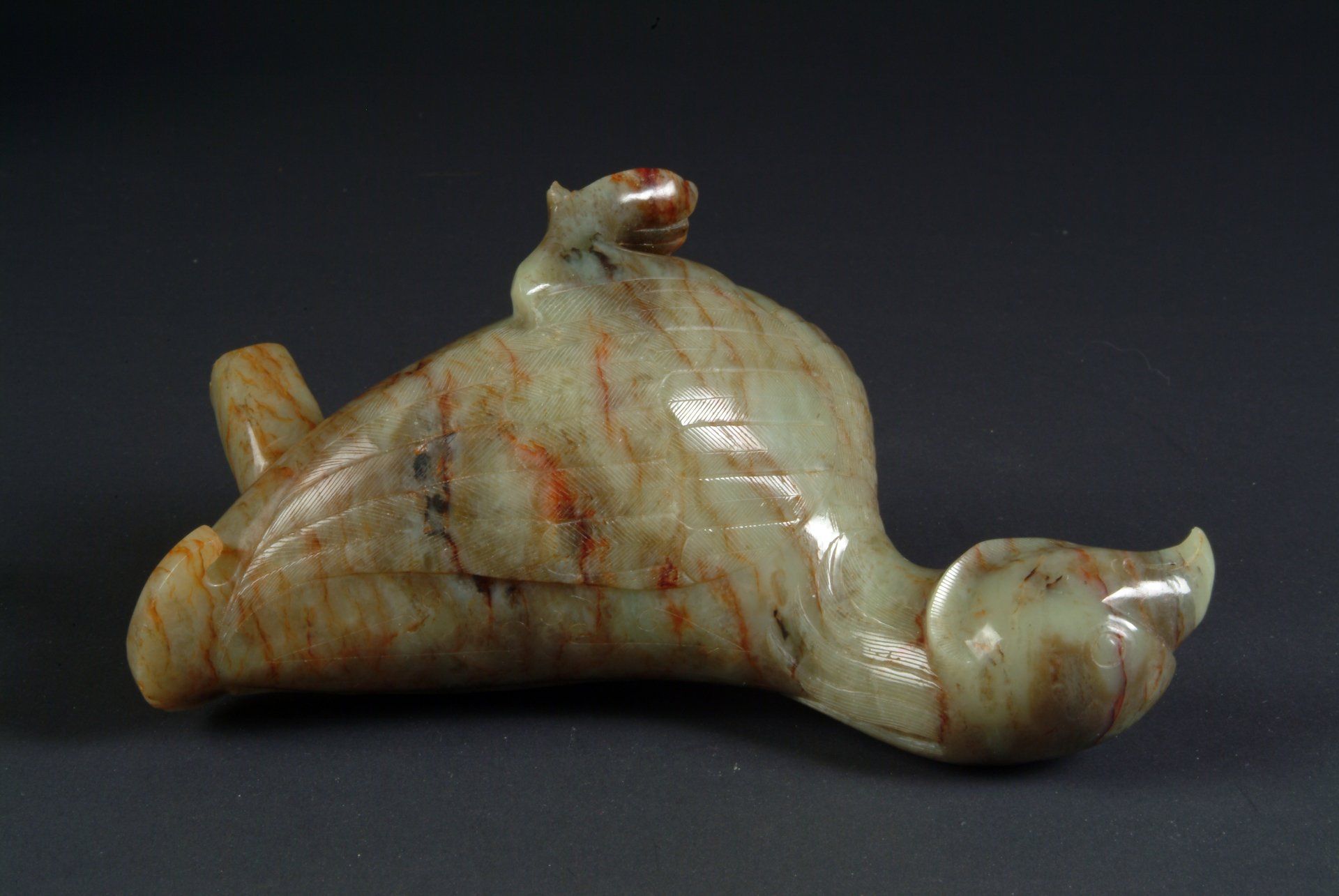 A meticulously crafted grayish-white jade mythical animal water vessel from the Ming Dynasty, exhibiting significant brownish-red inclusions, indicative of its antiquity. The carving style utilized further establishes its historical significance. The piece measures approximately 3.5 inches in length.