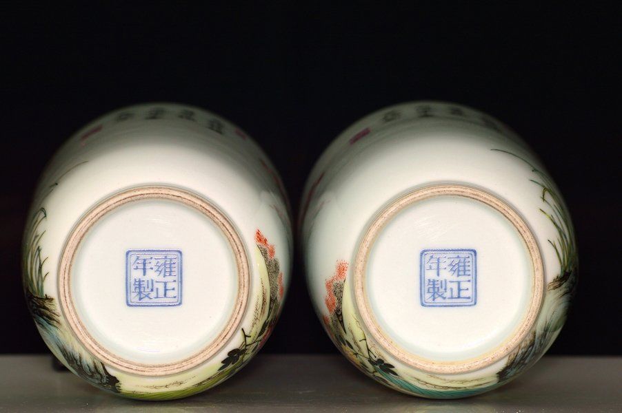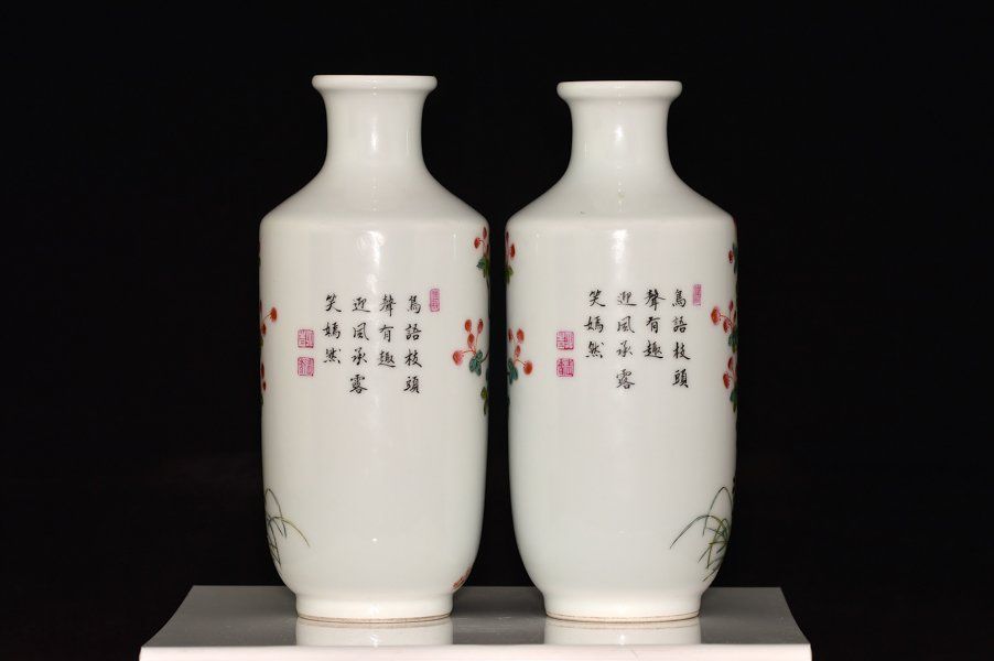 These Exquisite Famille Rose Vases are very thinly potted, and they were decorated in the Forbidden City in Beijing during the Yongzheng period 1723 to 1735. These vases were painted using Falangcai enamels and it is said that the Emperor himself oversaw the manufacture of these wares. It took such skill and control to create these Vases, Look close and you will understand what a true Chinese Ceramic Masterpiece looks like. It's important to look carefully and zoom in on the leaves, flowers, and branches you will see the detail, colors, and shading that gives balance and depth to these Vases. Collectors must learn to recognize the differences of a good piece compared to great piece or masterpieces. Most Qing Pieces if you look close at them you will see and understand they were painted by less skilled artist, they will look flat without balance, detail or depth. Pay attention to the details and color balance and shading this will help you to see and understand the difference. These vases are very delicate and decorated with branches, flowering prunus, and birds. On the reverse there is an inscribed poem with three seals. The Yongzheng mark on the base was added by the Beijing decorators in blue enamel, and the mark lines up with the poem which is typical in Yongzheng wares. The Yongzheng Falangcai color palette is distinct, making these wares easy to distinguish. This pair of vases are not exact copies of each other which is typical on Yongzheng wares. The Birds on these vases are so finely done the feathers took well over a thousand tiny strokes using a single hair brush to create their bodies this can only be seen using a loupe. Zoom in on the photos and you'll be able to see the tiny strokes on the Birds, and their bodies are only about 1/2" wide. The artist skill and control is incredible. The quality of these wares are magnificent, check your auction catalogs, books, museums, and see if you find a better pair of Yongzheng falangcai vases published anywhere. This pair of Vases measure