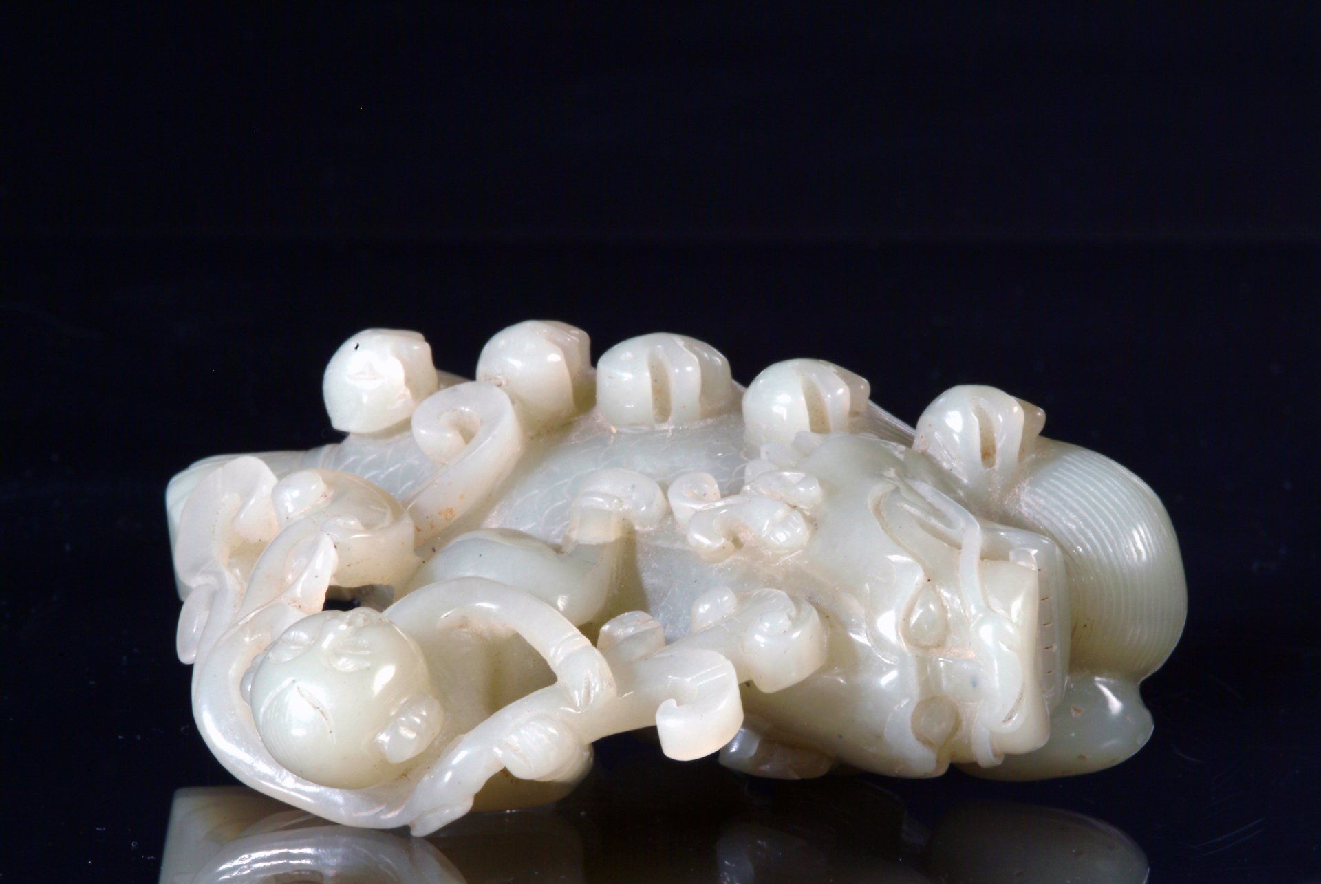 This intricately carved grayish-white jade sculpture from the Qing Dynasty, depicting three boys on a scepter, exhibits minor clouding indicative of its age and authenticity. The craftsmanship aligns with the stylistic characteristics of the period. The piece measures approximately 6.5 inches in length.