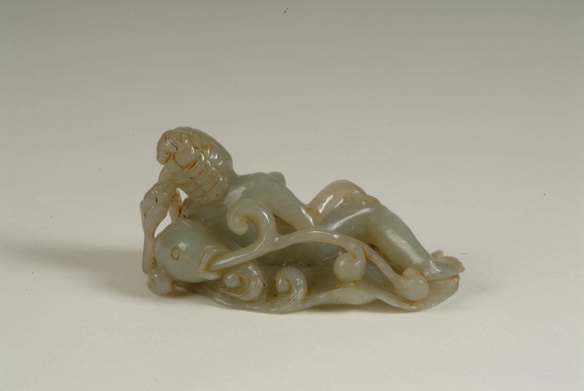 Qing Dynasty Grayish-White Jade Sculpture of a Nude Female Figure on a Lotus Leaf