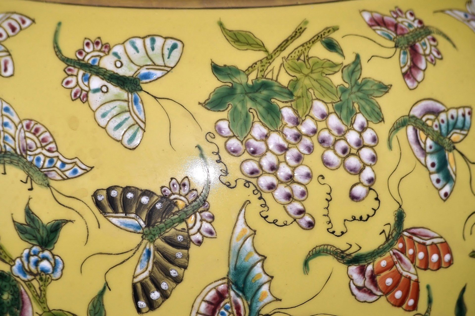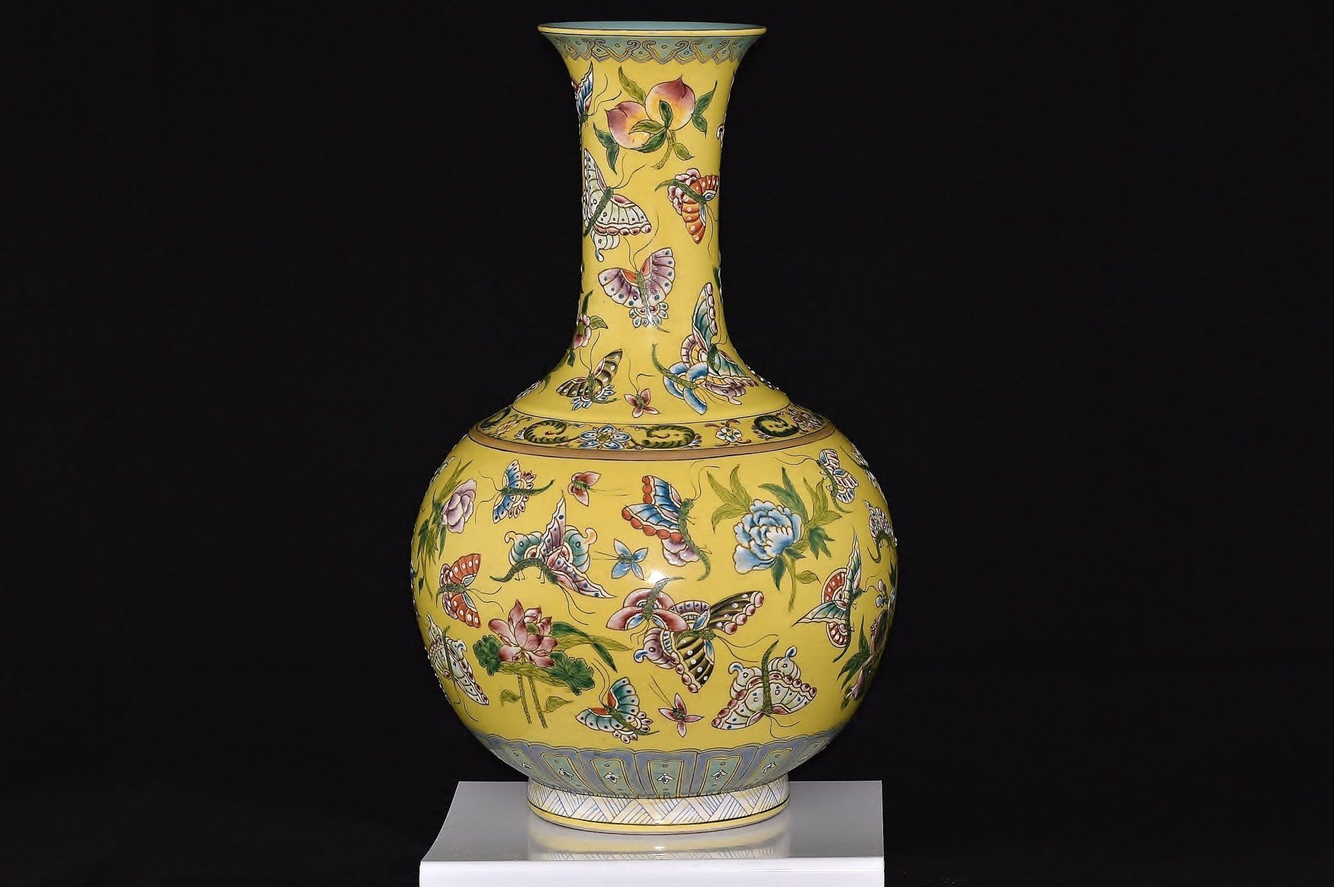 This exquisite Qing Dynasty vase features a fine yellow ground adorned with intricately incised motifs of butterflies, moths, fruits, and flowers. These elements are rendered in rich, thick enamel colors, while the remainder of the vase is finished in a more delicate application of thin enamels. Exhibiting a beautifully globular form, the vase is adorned with meticulously painted details. The base bears the blue under-glaze Qianlong seal mark, indicative of its authentic heritage. Evidence of age is reflected in the flaking of the biscuit, which further corroborates its provenance and period, with the vase standing at 16 3/4 inches tall.