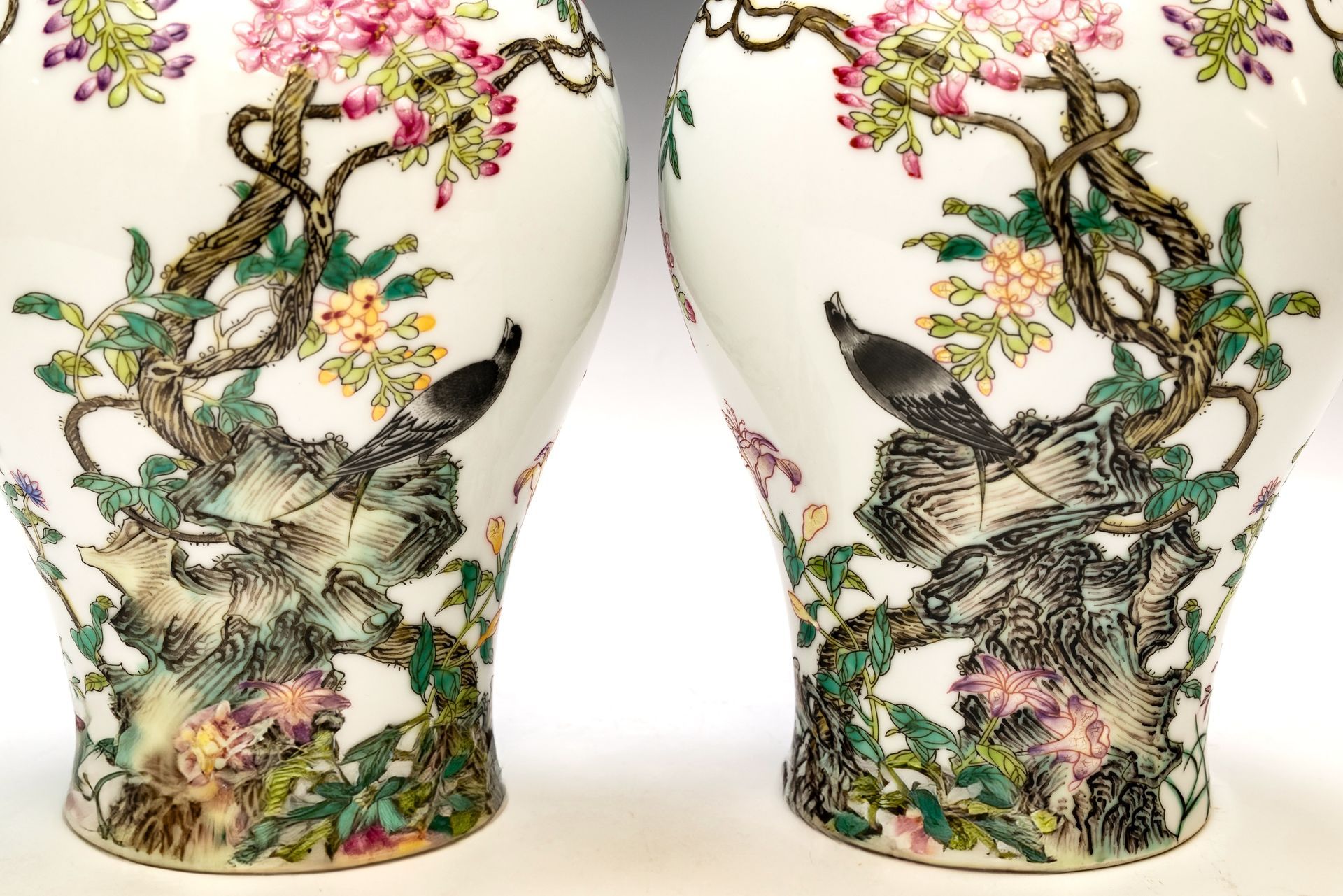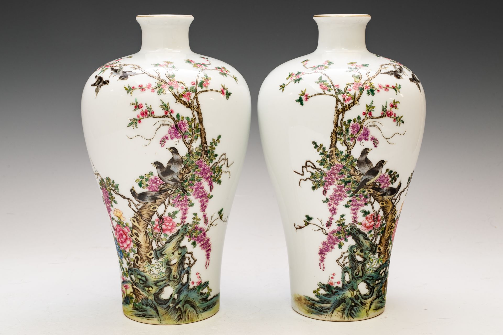 Imperial Mark and Period Yongzheng Pair of Falangcai Enamel Meiping Vases from the Qing Dynasty