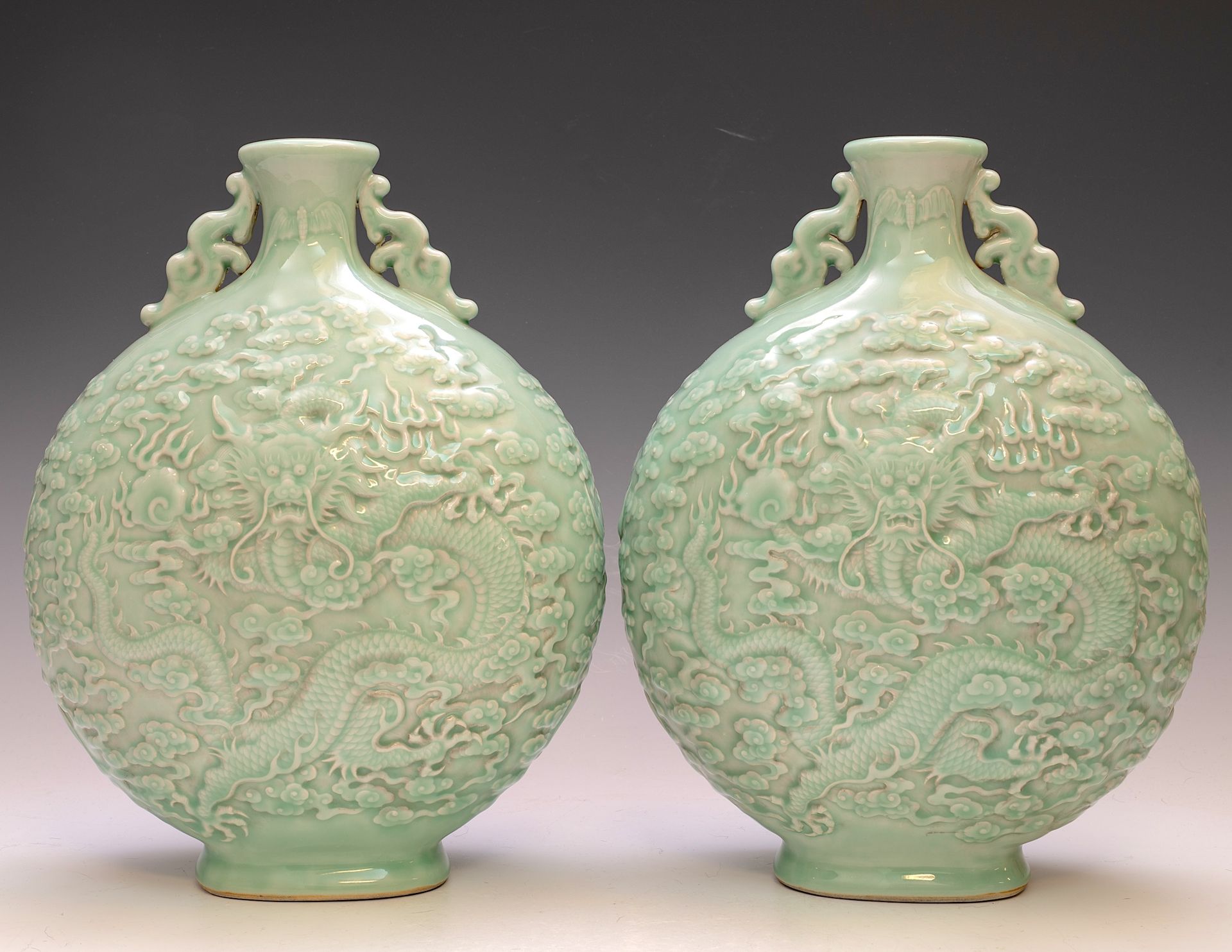 Imperial Qianlong Celadon Moon Flask Vases with Carved Dragon Motifs from the Qing Dynasty: Mark and Era Analysis