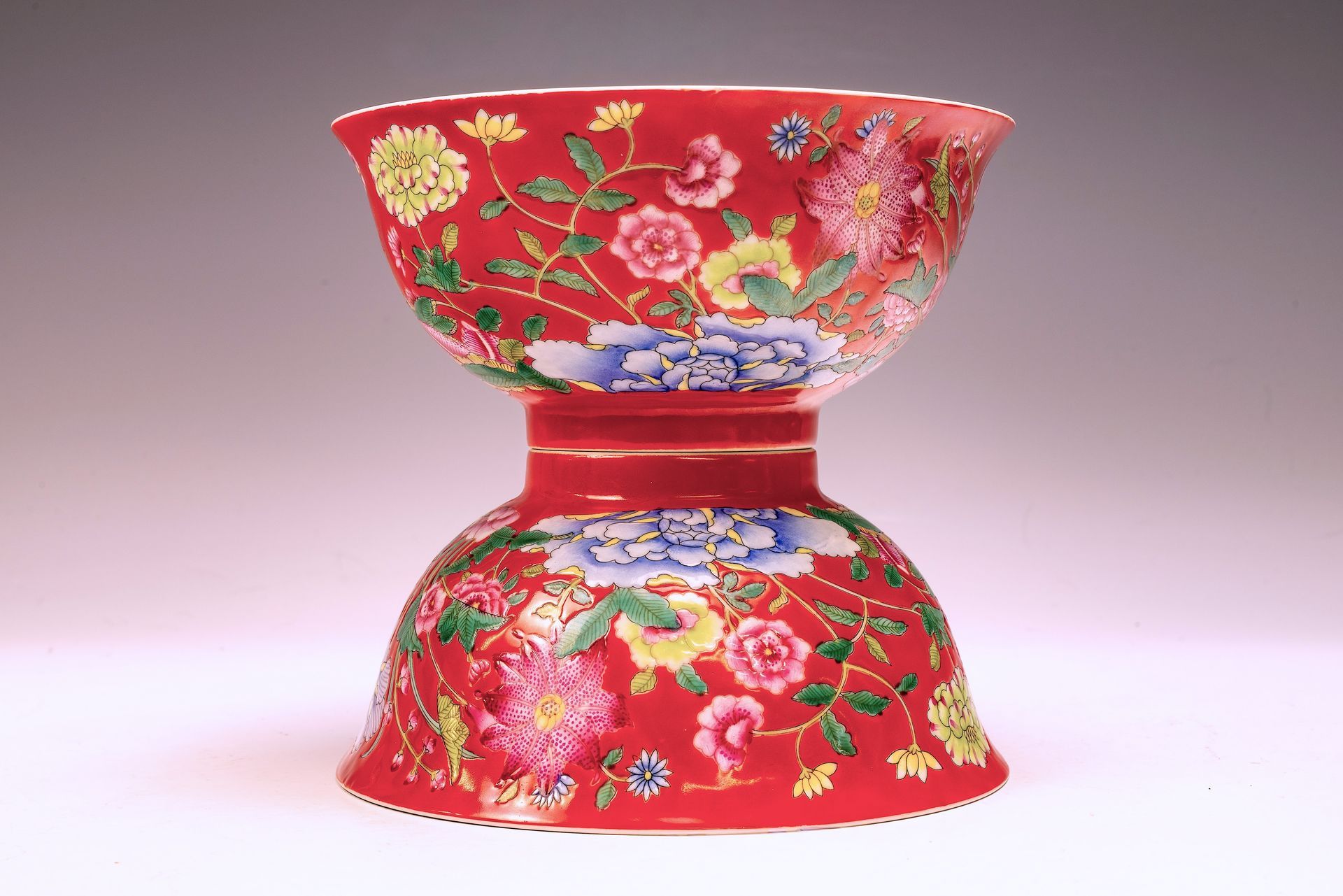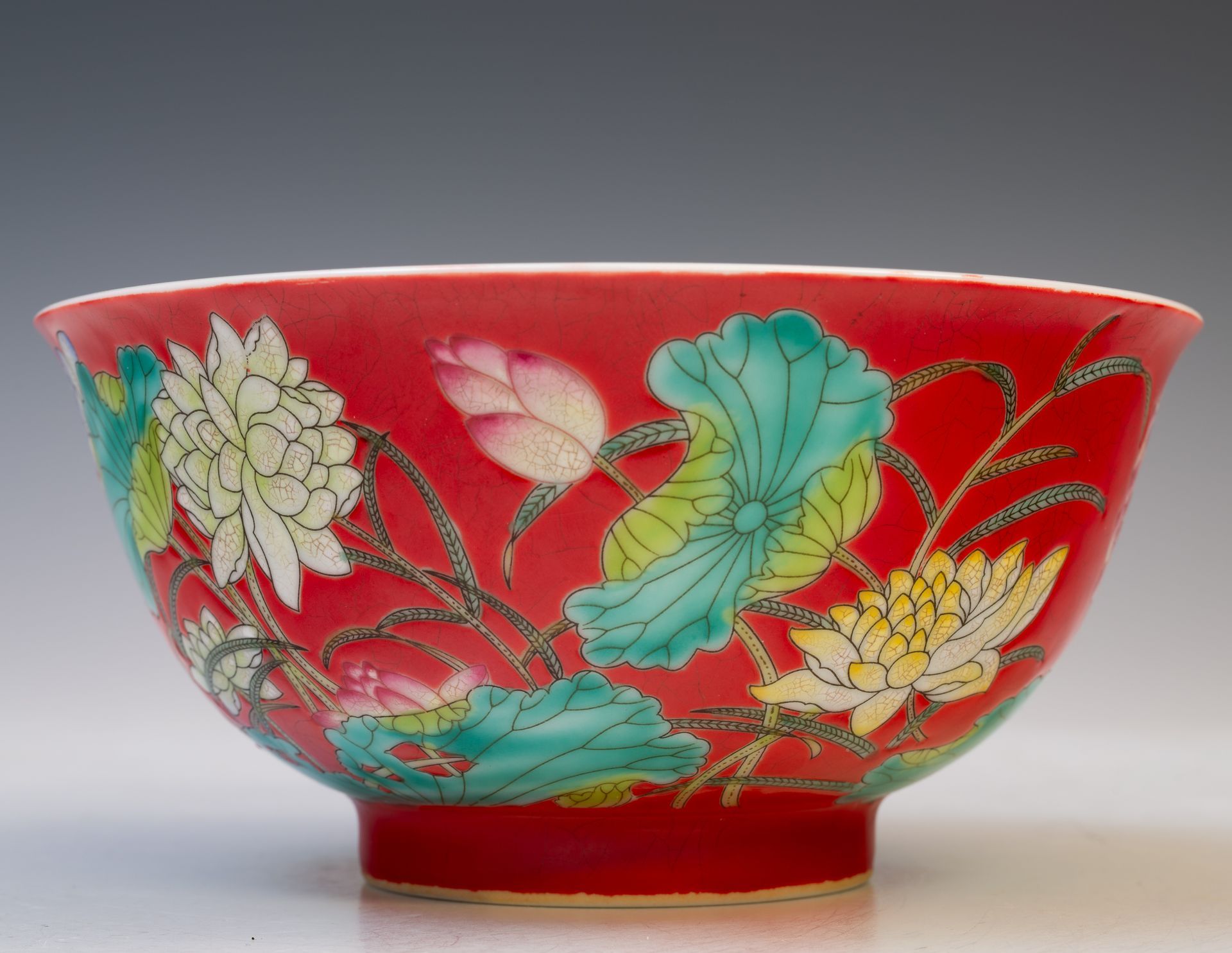 Kangxi Period Lotus Bowl with Ruby Red Ground and Falangcai Enamels, Exhibiting Blue Four-Character Yuzhi Mark Encased in a Double Square, Imperial Qing Dynasty