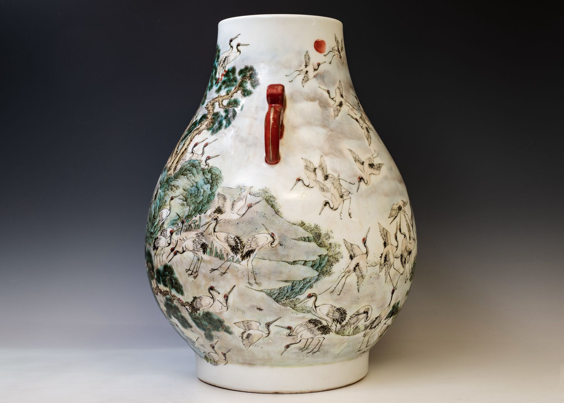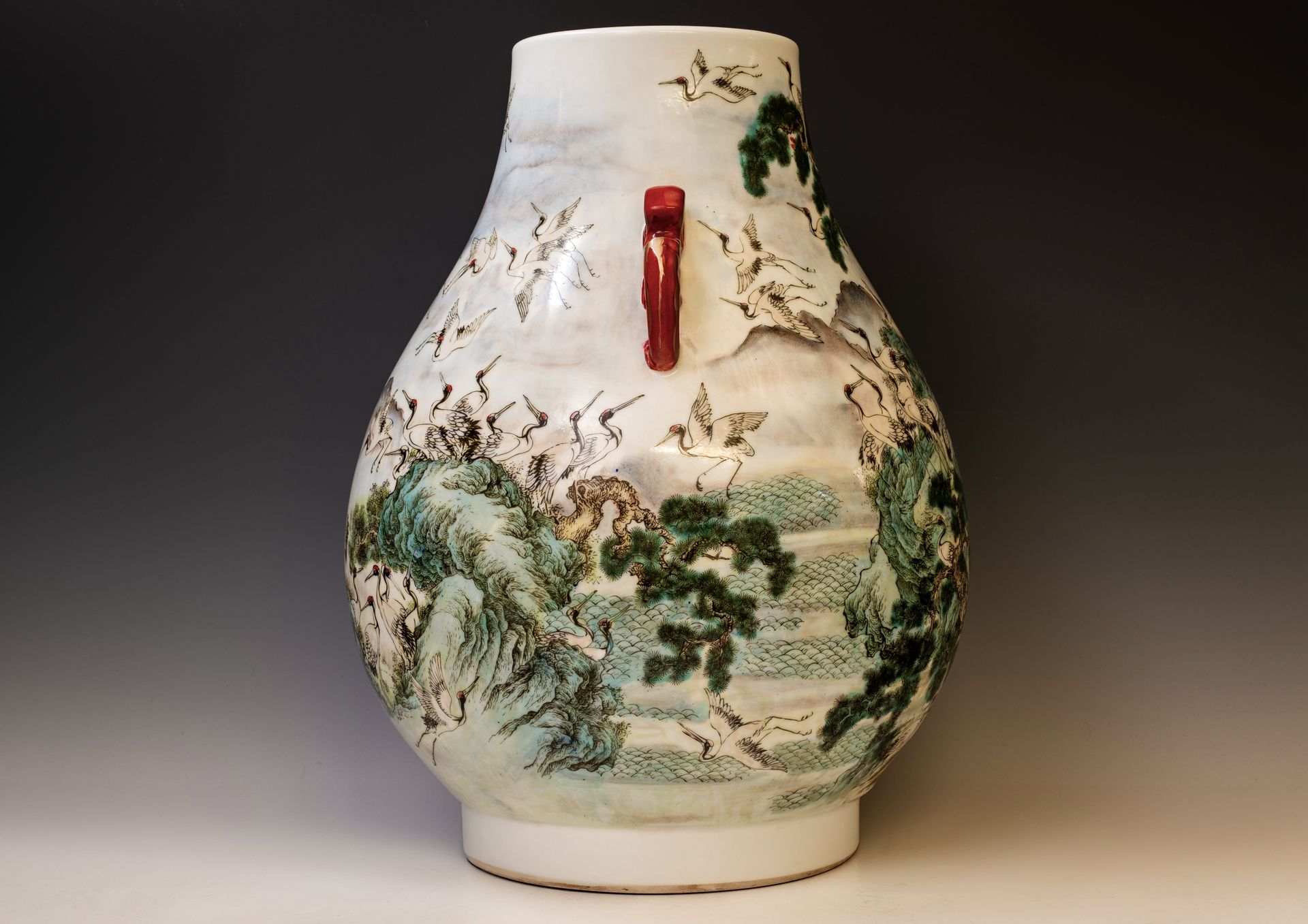 We proudly present a rare and significant famille rose vase, expertly crafted in hu form during the Qing dynasty, specifically in the Qianlong period (1736-1795). This exceptional artifact features a six-character seal mark in underglaze blue, which attests to its authenticity and historical importance. The vase is embellished with an intricate and continuous design showcasing a large flock of cranes against a meticulously detailed naturalistic backdrop. The composition demonstrates remarkable precision, highlighting exquisitely rendered enamelled rocky cliffs framed by dramatic mountain peaks, along with large, twisted pines and gnarled branches. Approximately half of the cranes are depicted perched among the pines and rocky outcrops, while the remaining birds gracefully soar above. A solitary peach, symbolizing longevity, is prominently illustrated, further enriching the thematic complexity of the piece. The other cranes elegantly navigate the waters below, encapsulating a tranquil and harmonious natural scene. The is selectively applied peach, indicating a deliberate artistic decision, possibly influenced by Jesuit aesthetics. Furthermore, the vase is adorned with stylized dragon handles, enameled in rich shades of iron red and gold, which exemplify the intricate craftsmanship characteristic of the era. An examination of museum collections, auction records, and private holdings confirms that this vase is among the finest crane vases of its kind globally, measuring an impressive 19 inches in height. ppjrs