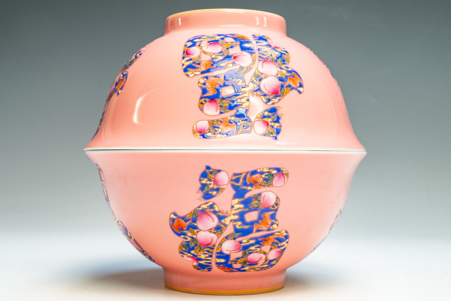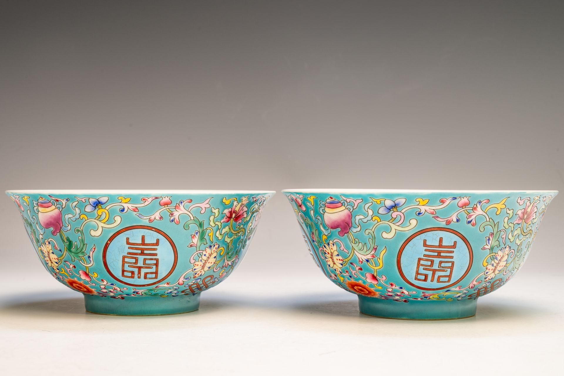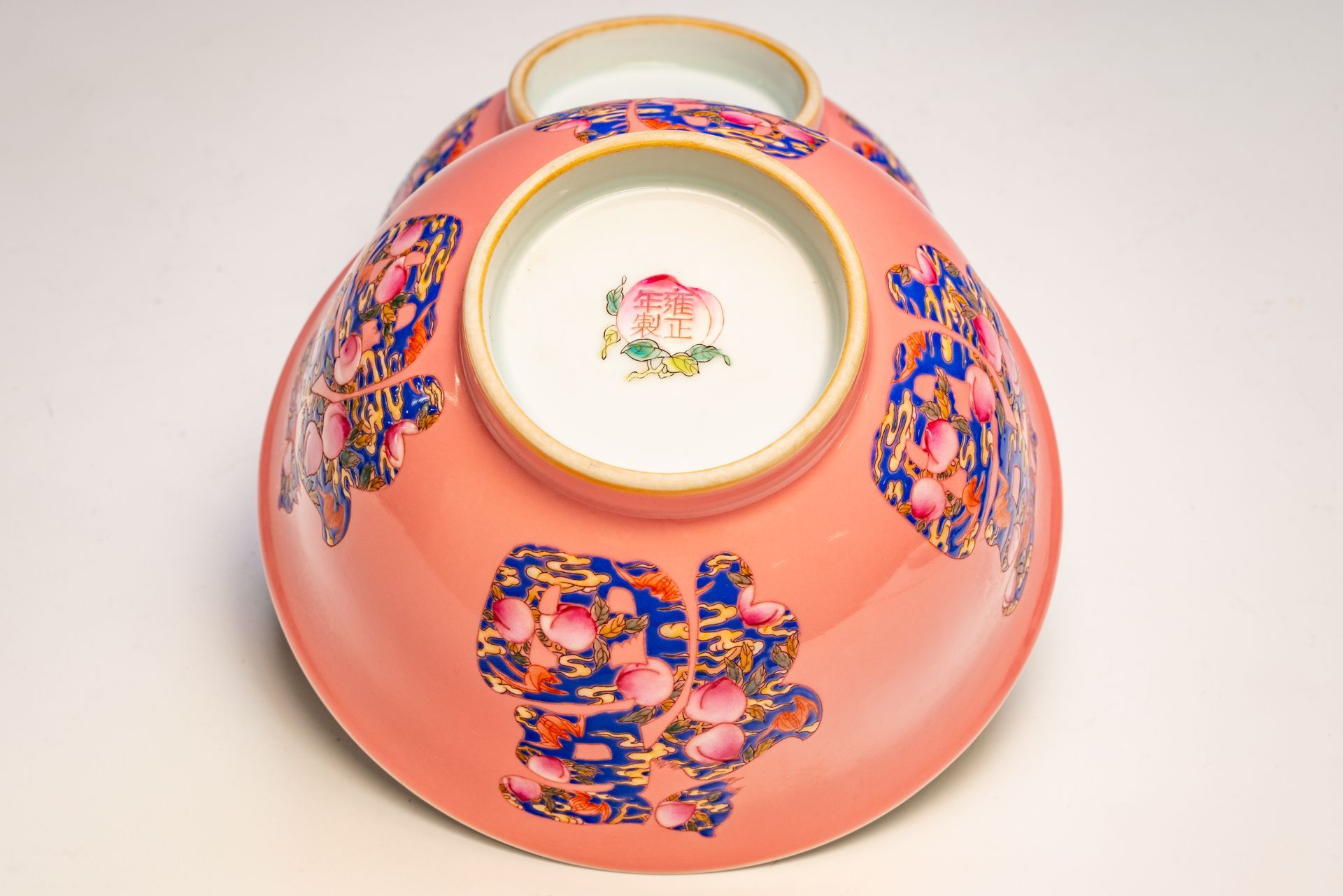 This distinguished pair of marked and period Yongzheng bowls from the Qing Dynasty displays exquisite craftsmanship, employing a falangcai palette of vibrant enamels. The bowls feature a striking pink ground adorned with four blue panels, each shaped like Chinese characters, and illustrate motifs of bats and peaches within these panels. Notably, each bowl includes a peach design on its interior and base, marked with the four-character Yongzheng gold inscription that owns the peach motif. Attention to detail is evident in the careful application of color, balance, and shading throughout these pieces. The bowls exhibit signs of flaking in the biscuit, which attest to their antiquity. Additionally, falangcai enamels are characterized by the presence of fine crazing, a feature these bowls distinctly possess, enhancing their aesthetic appeal. The overall color palette of the falangcai enamels adds to the beauty of this remarkable craftsmanship. Each Yongzheng bowl measures approximately 6 1/4 inches in diameter. ppjrs