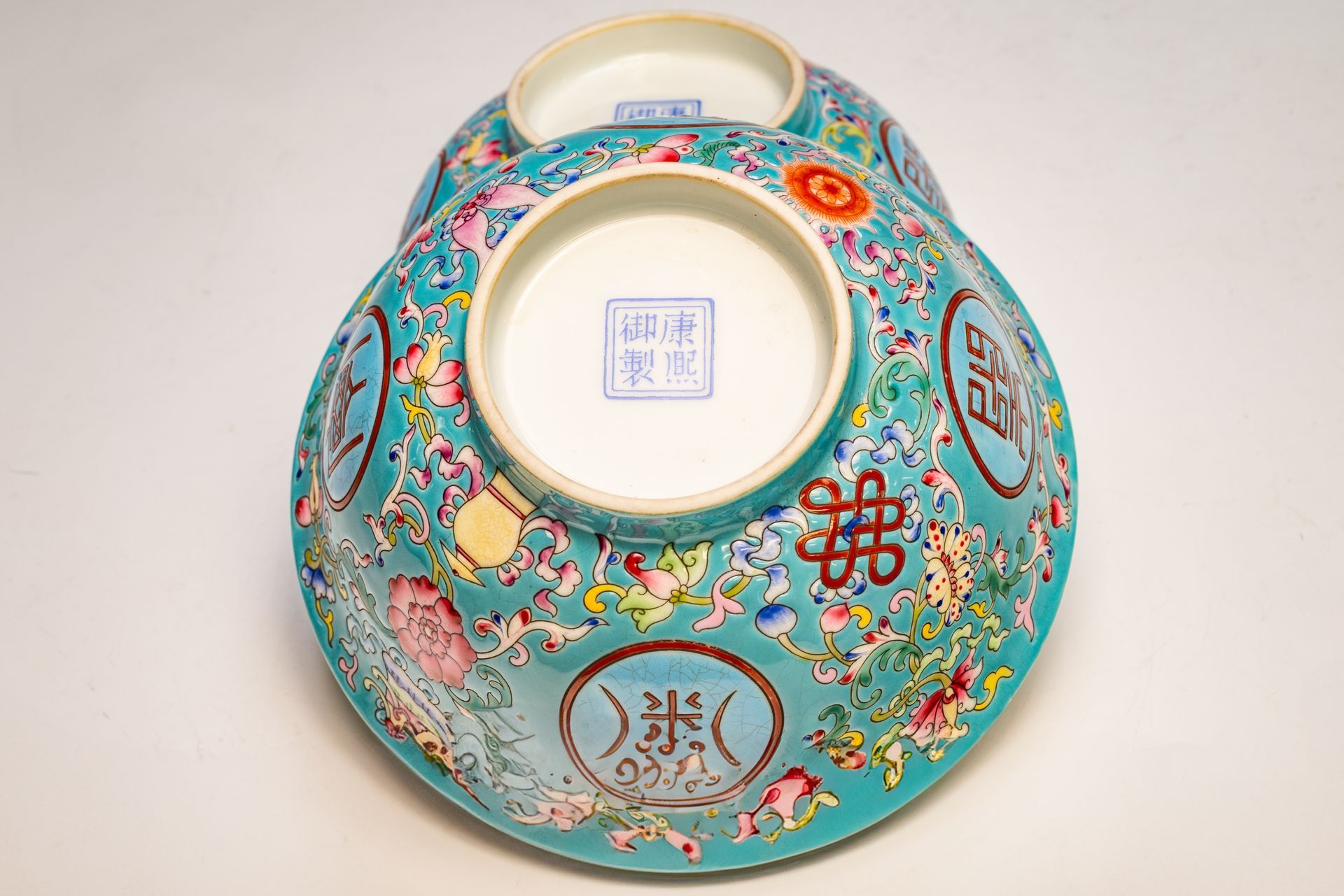This exceptional pair of marked and period Kangxi bowls from the Qing Dynasty exhibits a stunning form, utilizing the exquisite falangcai palette of colored enamels. Each bowl features four distinct panels adorned with Chinese characters, set against a blue background embellished with Buddhist symbols, scrolls, and floral motifs, all crafted in the falangcai style. Attention to detail is evident in the color balance and shading of these bowls. Furthermore, the presence of flaking in the biscuit underscores their antiquity. Notably, falangcai enamels are distinguished by fine crazing, a characteristic exhibited in these pieces, enhancing their aesthetic appeal. The bowls are marked with the Kangxi four-character yuzhi mark in blue, enclosed in double squares, located on the base. Each bowl measures approximately 5 7/8 inches in diameter. ppjrs
