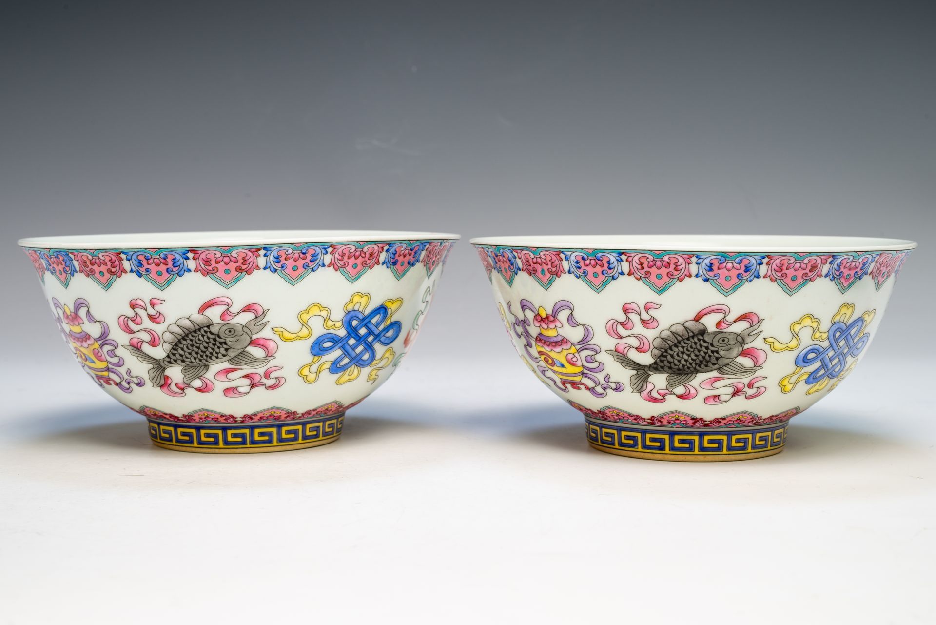 Pair of Qing Dynasty Imperial Yongzheng Period Bowls Adorned with Eight Buddhist Symbols, Featuring Blue Four Character Yuzhi Mark and Period in a Double Square Design