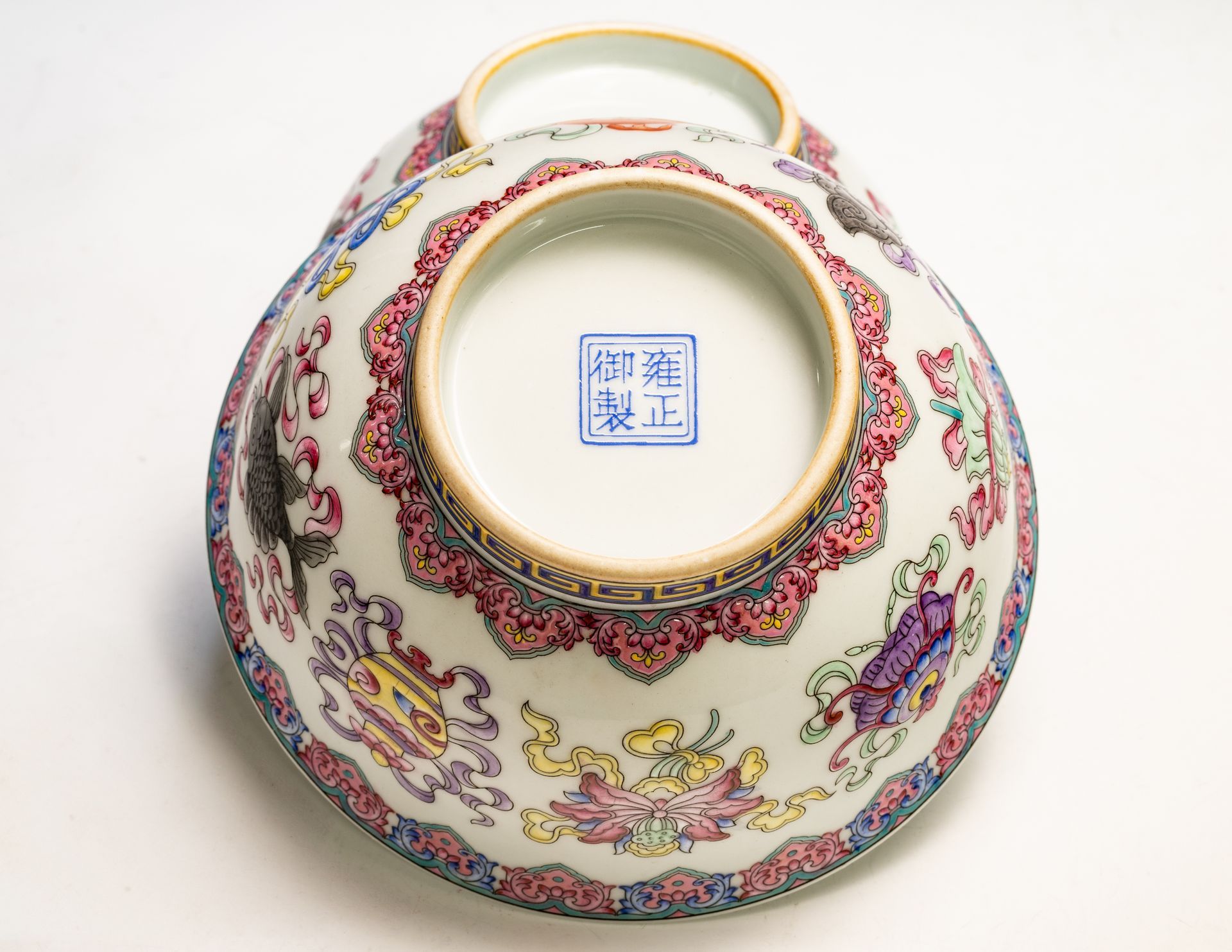 Imperial Yongzheng Period Story Bowls from the Qing Dynasty, Decorated with Falangcai Palette and Inscribed with Four-Character Yuzhi Mark within Double Squares