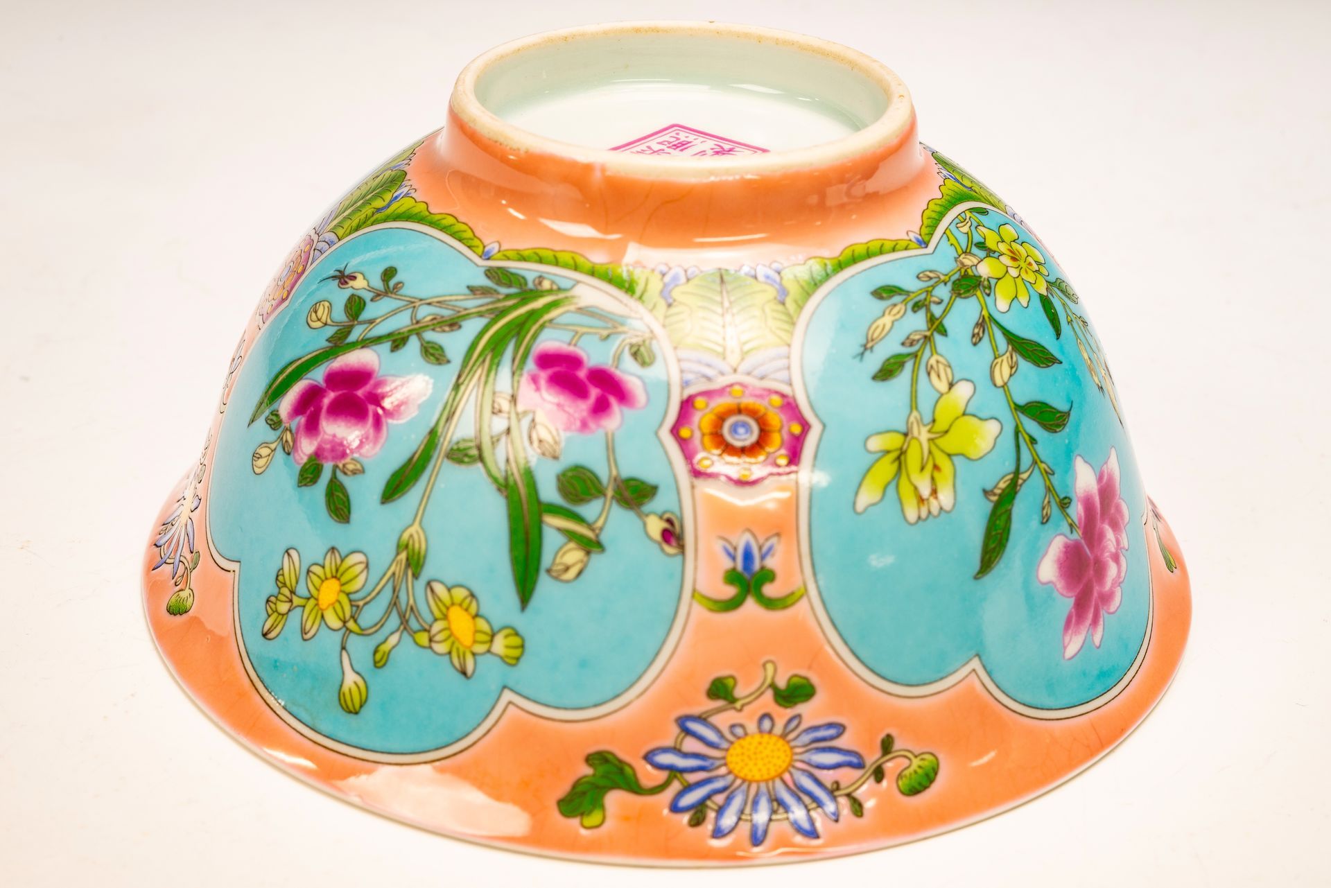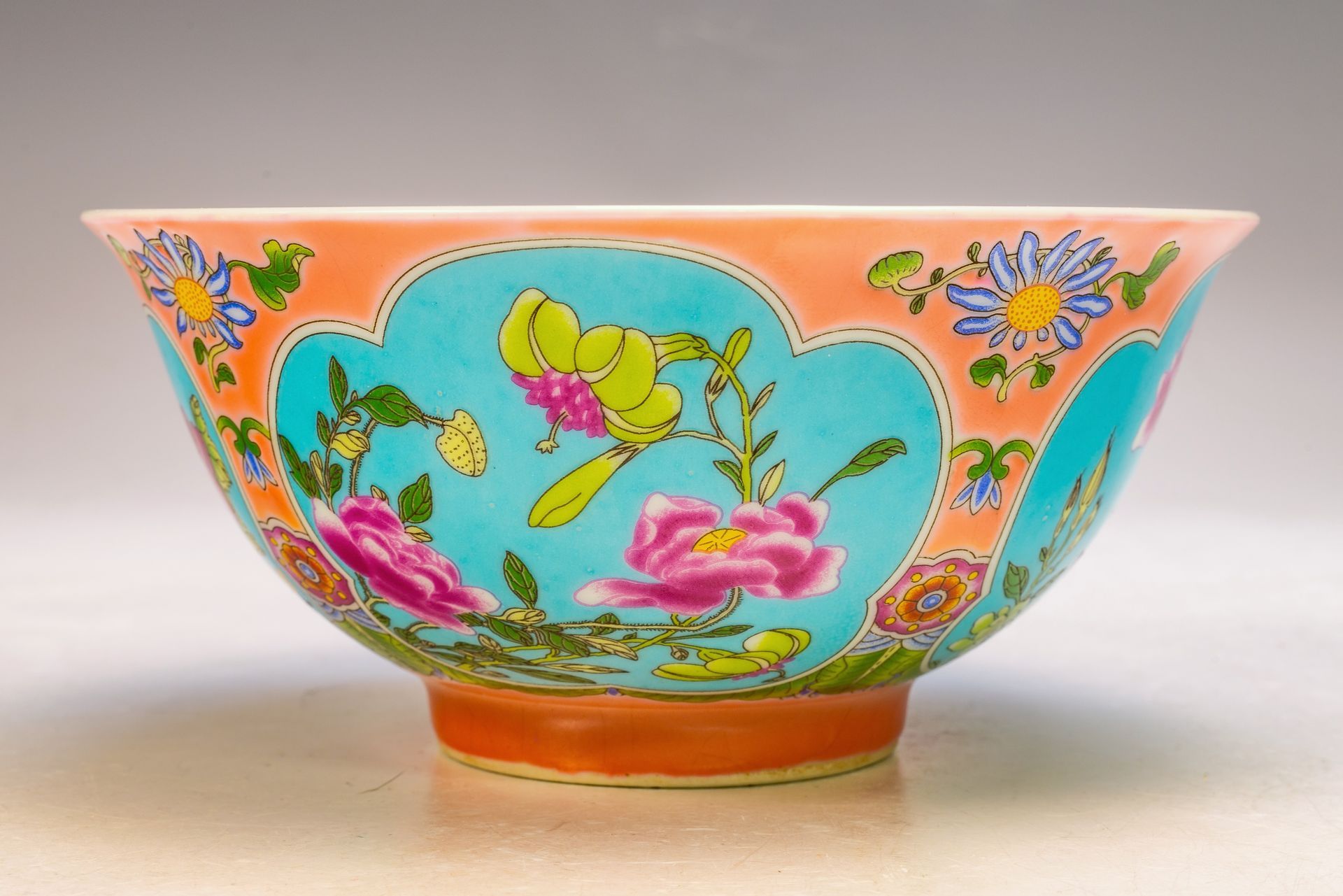 This exquisite Kangxi Falangcai bowl showcases a remarkable form complemented by a vibrant palette of colored enamels. The rich pink floral motifs, alongside the striking green and yellow tones of the leaves and the sky blue adorning the bowl's four panels, create a captivating interplay against a delicate orangish-pinkish ground. A thorough analysis of the intricate details, color balance, and shading enhances one’s understanding of the unique characteristics that render this Falangcai Kangxi bowl a remarkable artifact. The presence of slight flaking in the biscuit serves as evidence of its historical age, while the limited crazing found in the enamels is characteristic of Falangcai pieces. The bowl's allure is further intensified by its captivating color palette. Notably, it is marked with the Kangxi four-character yuzhi inscription, elegantly executed in deep pink, inside the double squares at the base. Measuring approximately 5 7/8 inches in diameter, this meticulously crafted Kangxi bowl represents a significant contribution to the field of fine porcelain. ppjrs