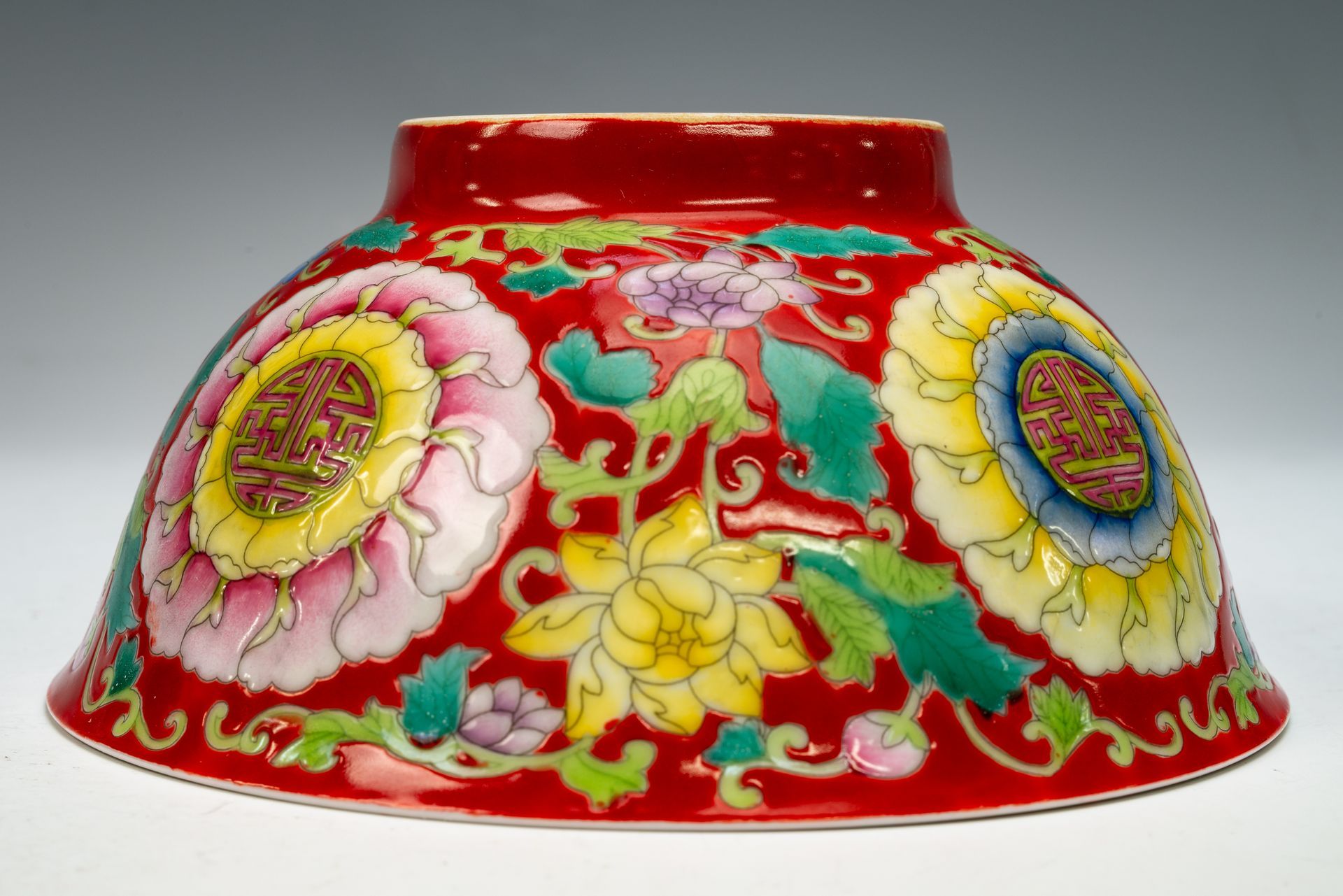 Imperial Qing Dynasty Kangxi Lotus Bowl with Ruby Red Ground and Falangcai Enamels, Featuring a Puce Enamel Four Character Yuzhi Mark & Period within a Double Square