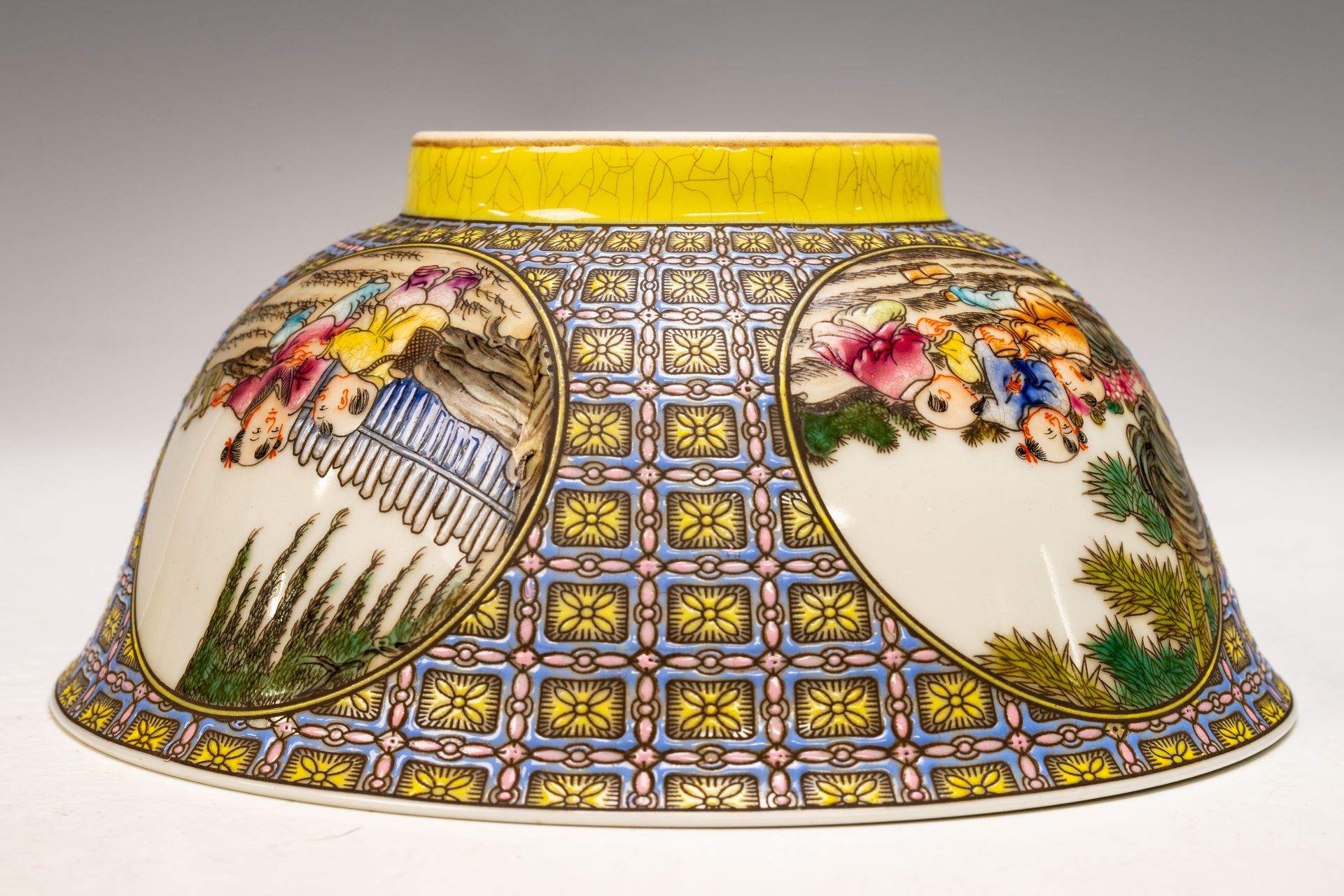 This Qing Dynasty-marked Kangxi Children Playing Bowl exemplifies exquisite craftsmanship and artistry, utilizing a falangcai palette of vibrant colored enamels. The bowl features four distinct panels, each depicting various youthful revelries against a rich yellow background adorned with intricately incised patterns, showcasing detailed applications of blue and pink enamels. A meticulous examination reveals the careful attention paid to detail, color balance, and shading within each panel, indicative of the considerable skill required to produce such a masterpiece. Notably, the bowl displays flaking in the biscuit, a characteristic indicative of its age. The falangcai enamels are distinguished by their fine crazing, a feature present in this piece, enhancing its historical significance. The bowl is further identified by the Kangxi four-character yuzhi mark, executed in blue with double squares, found on the base. This Kangxi Bowl has a diameter of approximately 6 inches, affirming its authenticity and importance as a collectible item. ppjrs