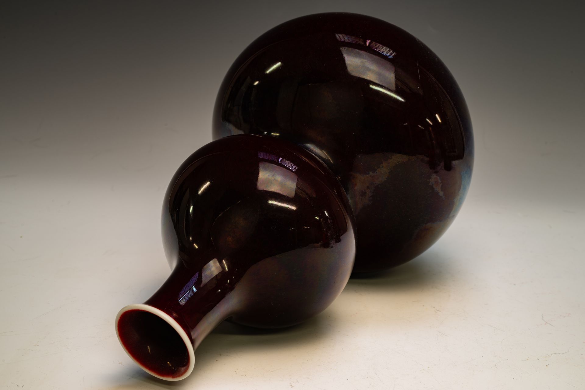 This double-gourd-shaped vase from the Yongzheng period of the Qing Dynasty is exceptionally crafted, exhibiting a strikingly beautiful black cherry hue. The piece is well-proportioned and demonstrates high-quality pottery techniques. It features a four-character Yongzheng mark on the base, indicative of its period, and exhibits iron firing marks on the foot ring. Additionally, the presence of flaking in the biscuit suggests its antiquity. The vase measures approximately 11 1/8 inches in height. ppjrs