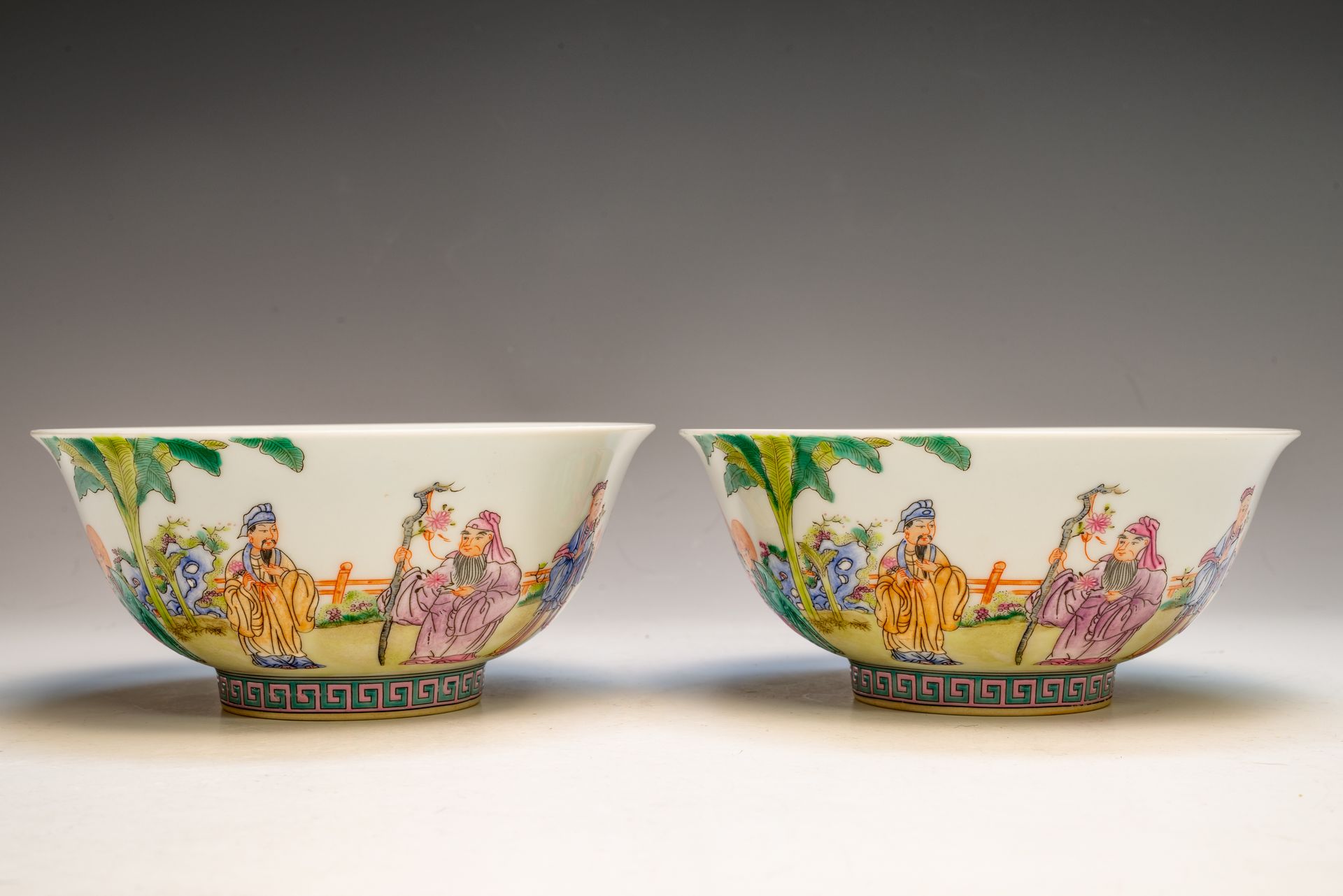This distinguished pair of Yongzheng story bowls from the Qing Dynasty is both marked and authentic to the period. Crafted with exquisite form, these bowls utilize the falangcai palette of colored enamels, which is notable for its vibrant hues and intricate details. Each bowl narrates a traditional Chinese story, with finely rendered figures that exemplify the artistry characteristic of falangcai enamels. The undersides of the bowls are adorned with the four-character Yongzheng Yuzhi mark, rendered in blue enamel within a double square—a hallmark of quality and authenticity. Attention should be drawn to the meticulous details, color balance, and shading that define these pieces. It is important to note the presence of some flaking in the biscuit, an indication of their age, while only minimal crazing is evident in the enamels, which often characterizes falangcai wares. The color palette itself remains remarkably beautiful. Each Yongzheng bowl measures approximately 6 1/4 inches in diameter. ppjrs