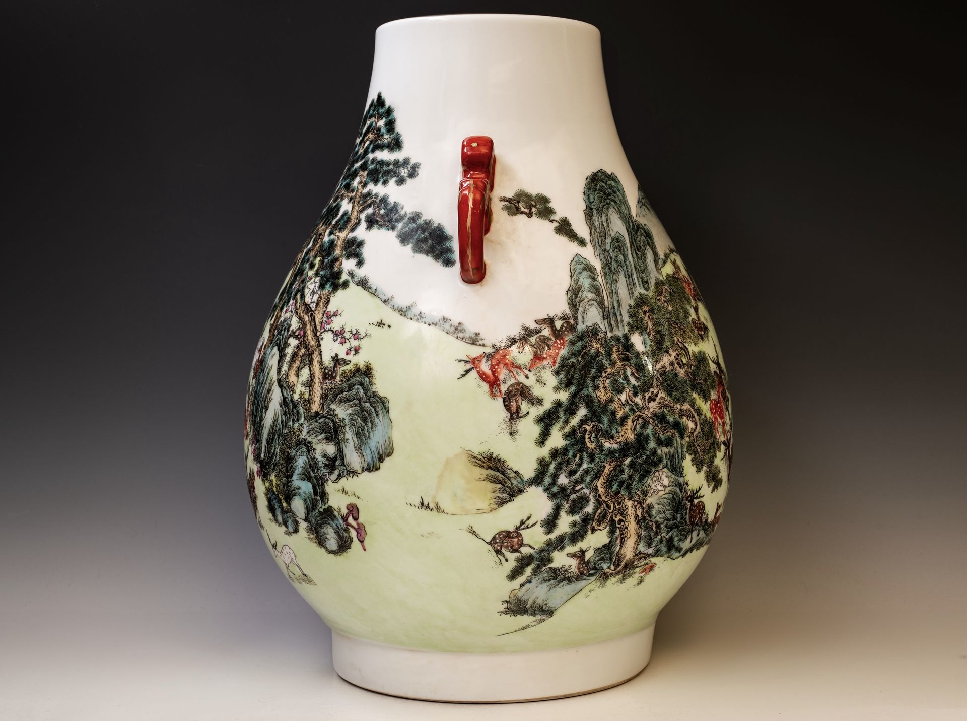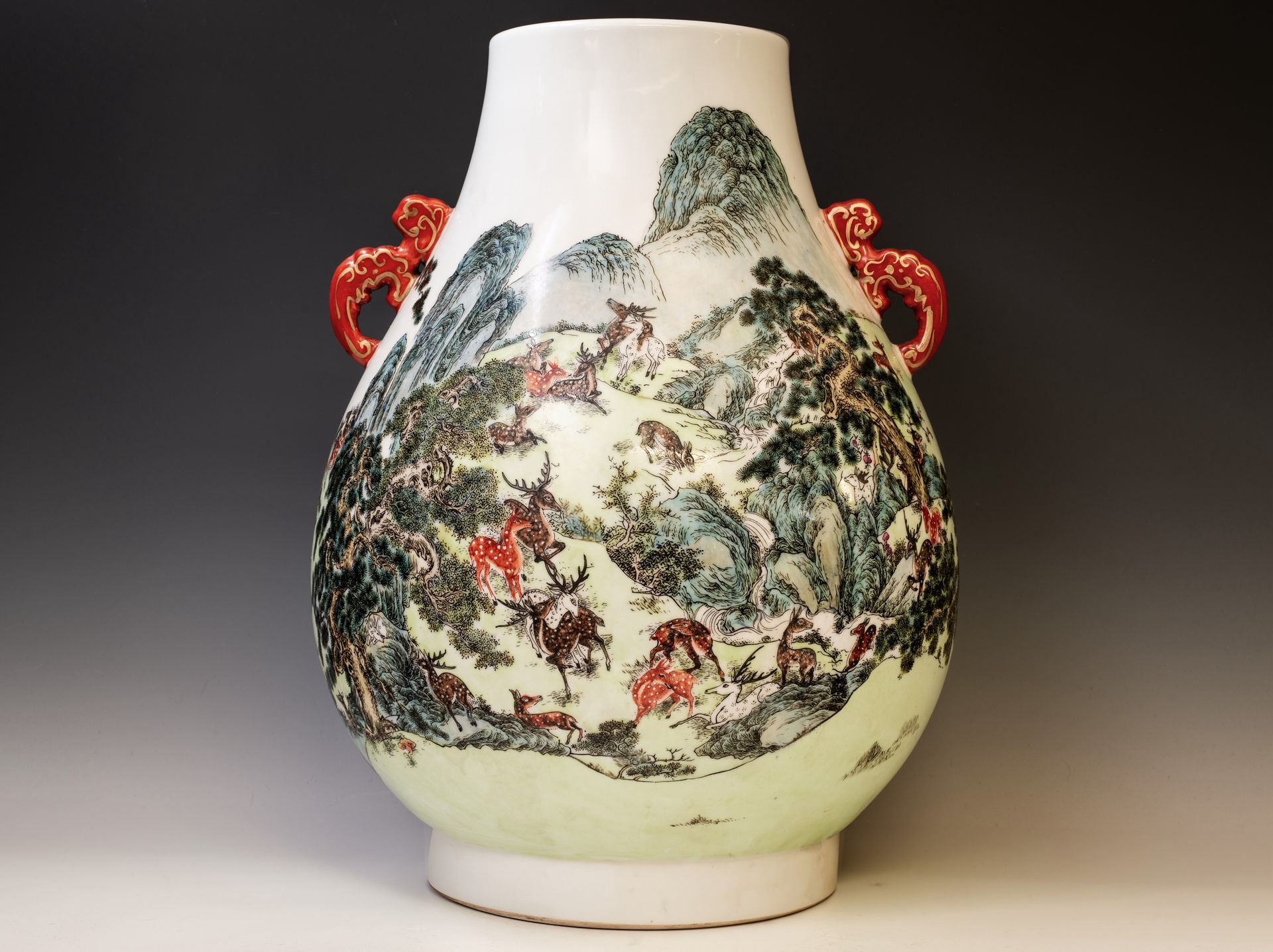 We are pleased to present a remarkably rare and exquisite famille rose hu vase, meticulously crafted during the Qing dynasty, specifically under the Qianlong reign, as indicated by the six-character seal mark in underglaze blue, dating from 1736 to 1795. This exceptional artifact is adorned with a continuous motif that elegantly depicts a herd of deer within a meticulously rendered naturalistic landscape. The brushwork and the colors applied to the rocks, trees, and deer are all rendered with incredible realistic accuracy and artistic ingenuity. The level of detail showcases extraordinary precision, with exquisitely enamelled fur illustrating the deer engaged in various activities such as frolicking, resting, and playing against an opulent chartreuse background. The composition is further enriched by a rocky terrain accentuated with elegantly twisted pine trees, branches bearing peaches, and the vibrantly multi color lingzhi fungus. A river gracefully meanders through the mountainous backdrop, adding depth and dynamism to the piece. The vase's handles are artistically designed in the form of stylized chilong dragons, enameled with iron red and gold, further contributing to its grandeur. Upon examination of collections, museum holdings, and auction results, it is evident that this vase ranks among the finest—if not the singular exemplary—Hundred Deer Vases in existence worldwide. The overall height of this magnificent piece is 19 inches. ppjrs