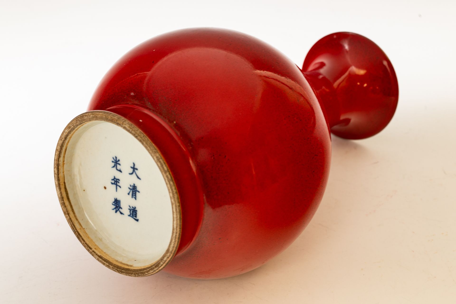 This exquisite vase, originating from the Qing Dynasty and specifically the Daoguang period, features a pear-form design. It is expertly crafted, exhibiting a remarkably rich red hue that is visually captivating. The vase shows evidence of flaking in the biscuit, indicative of its age, and is marked on the base with the six-character Daoguang mark. The vase measures approximately 8 7/8 inches in height. ppjrs
